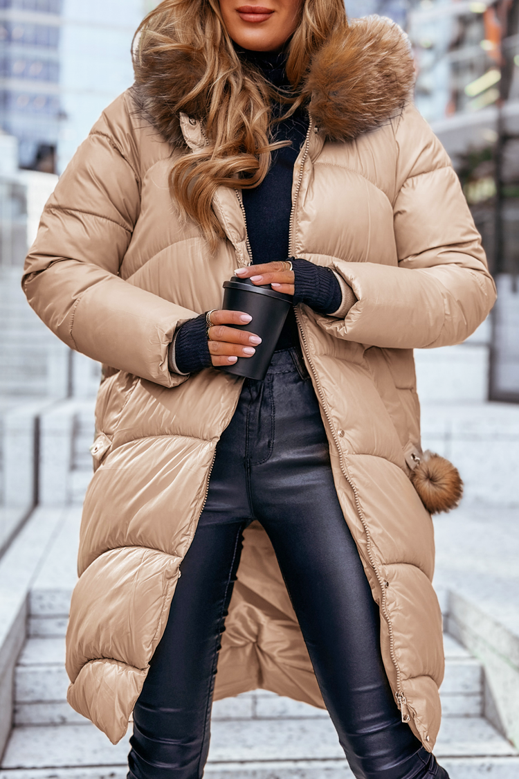 - A modell szörmés kapucnival és praktikus zsebekkel ellátott, kapucnival, steppelt kialakítással és dekoratív szörmével rendelkezik a zsebnél.