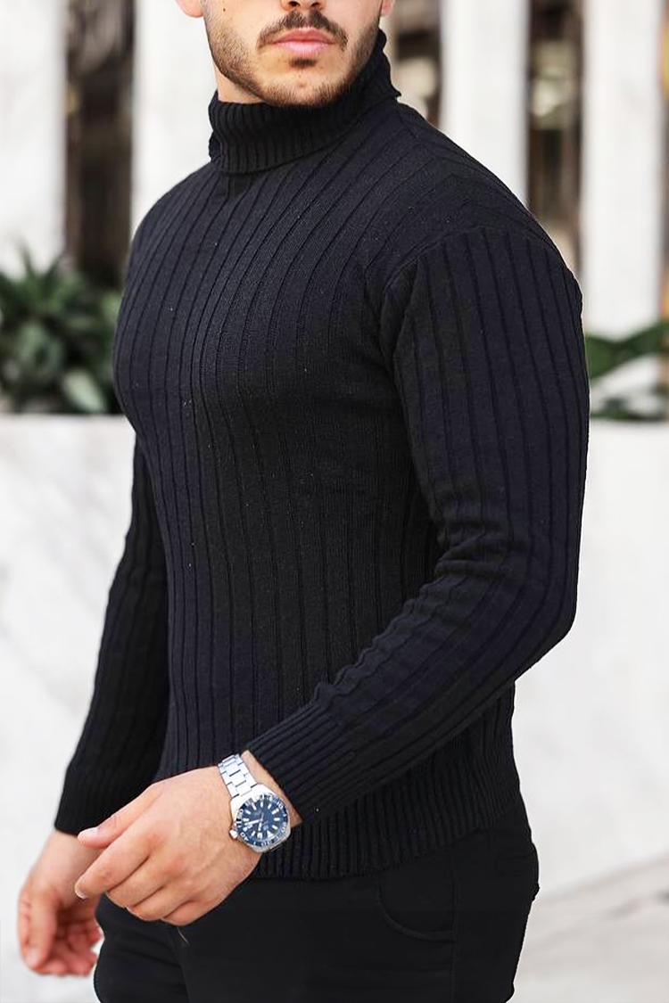 - Kényelmes férfi pulóver magas nyakkal, függőleges bordázott mintával, fekete színben, amely különféle kombinációkhoz illik.
