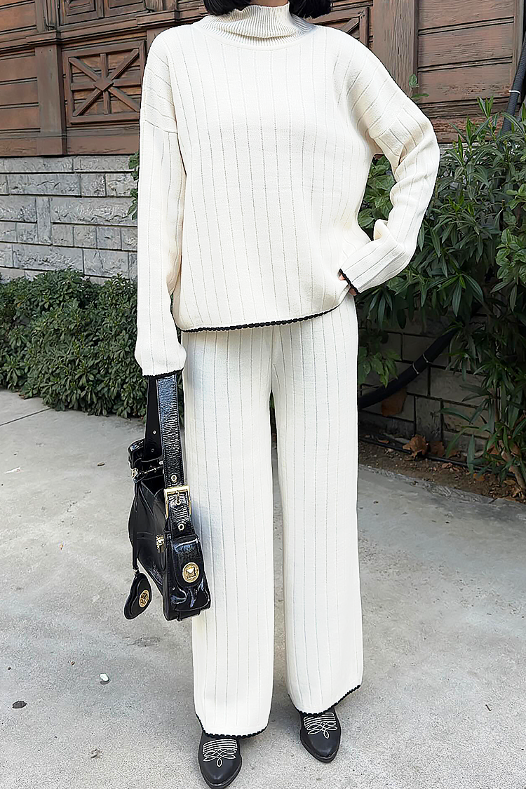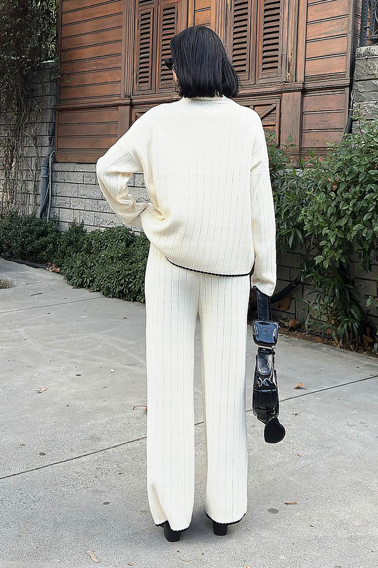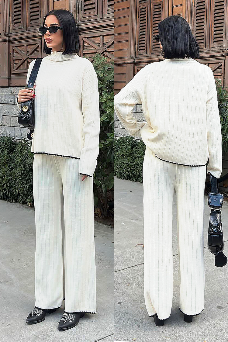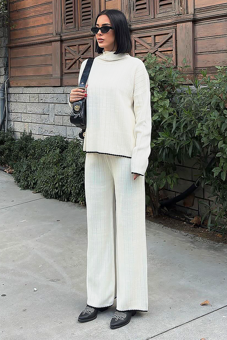 - A felső laza szabású, a nadrág magas derekú és széles szárú.
