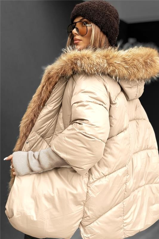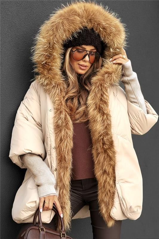 - A modell kényelmes szabással, gombos rögzítéssel, bő kapucnival és teljes hosszában szörmével rendelkezik.