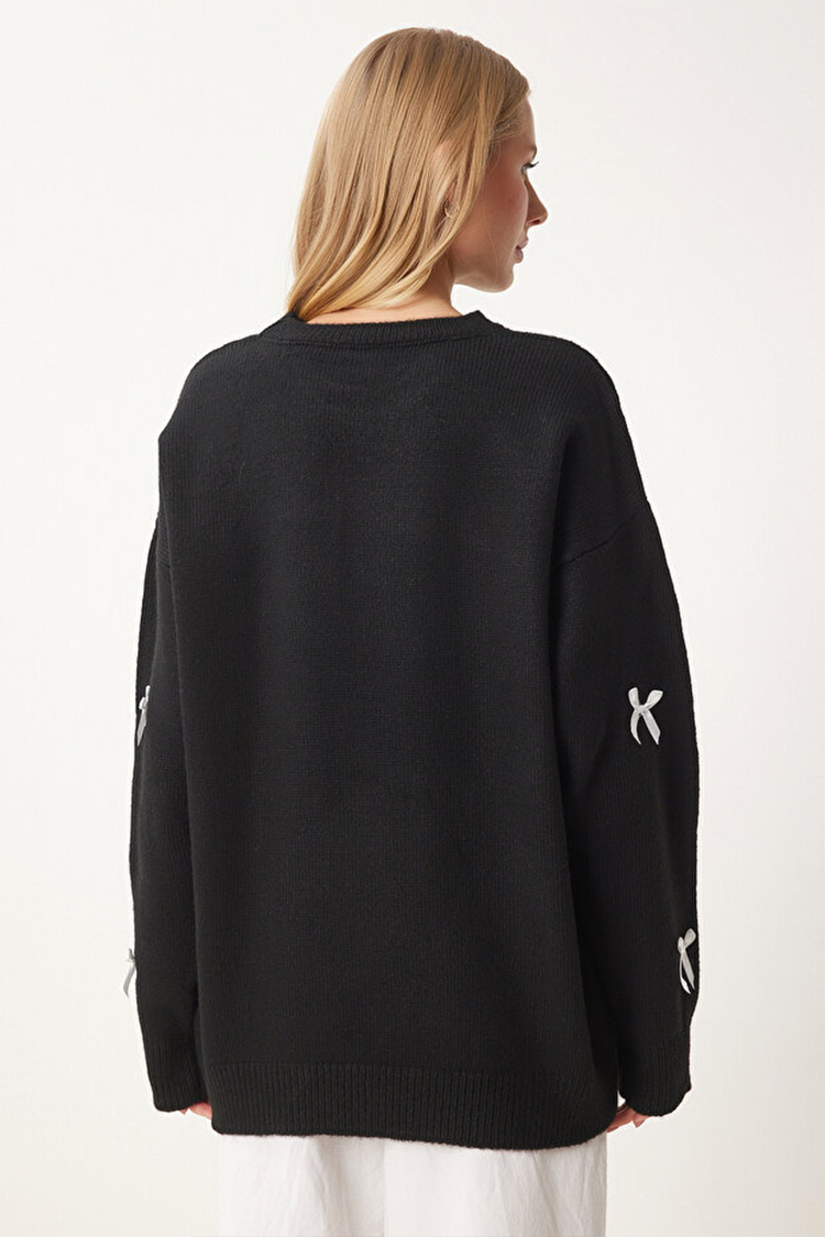 - A modell klasszikus oversized szabással, kerek nyakkivágással és masnikkal teljes hosszában.