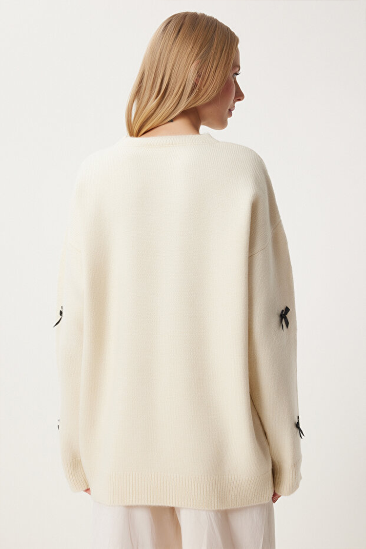 - A modell klasszikus oversized szabással, kerek nyakkivágással és masnikkal teljes hosszában.