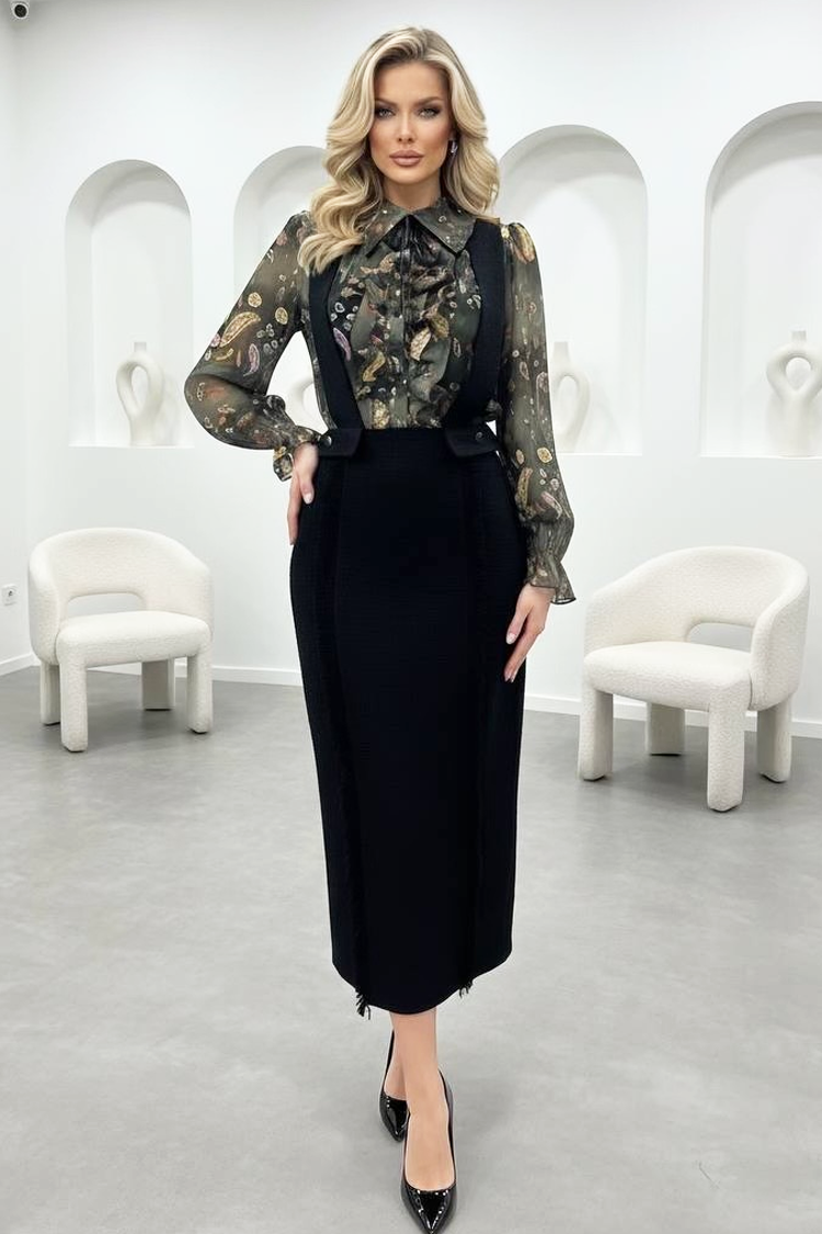 - A modell testhezálló szabással, stílusos pántokkal és látványos, hosszú ujjú sifon felsőrésszel rendelkezik.