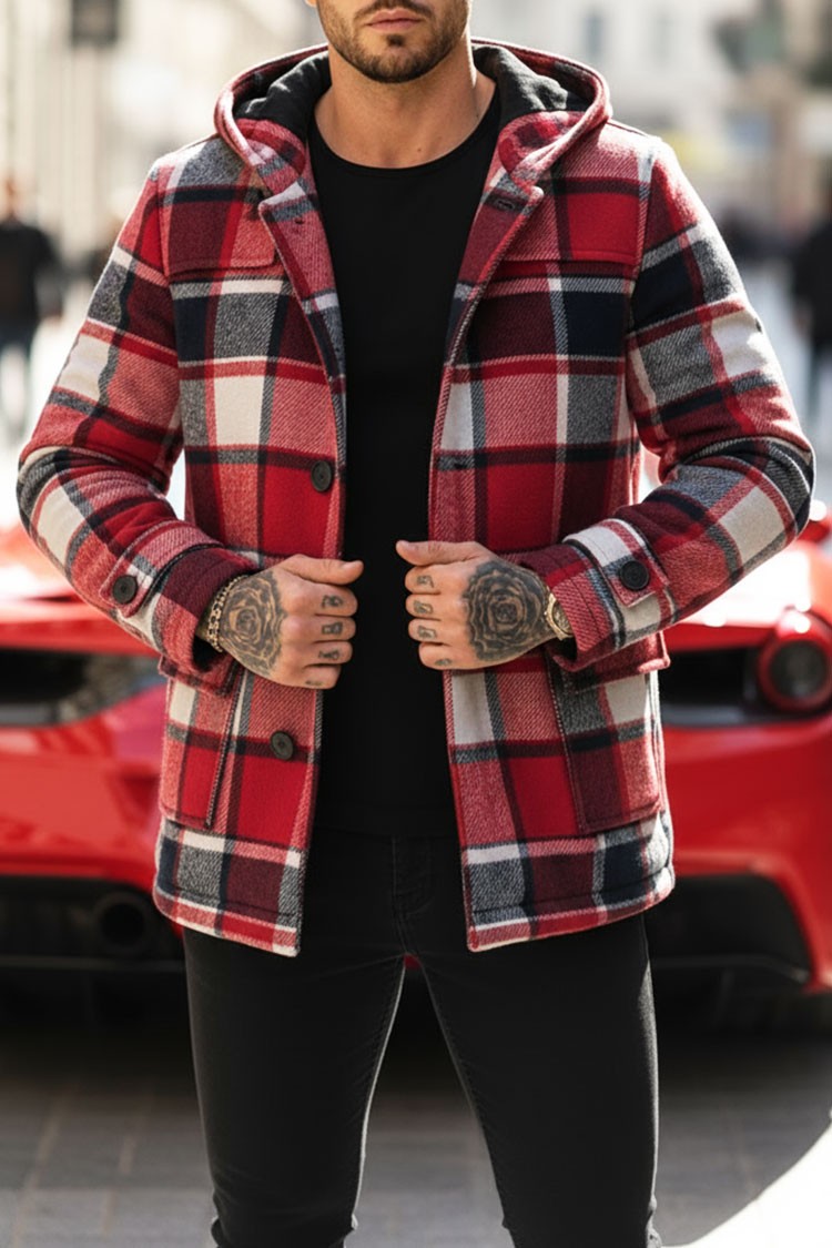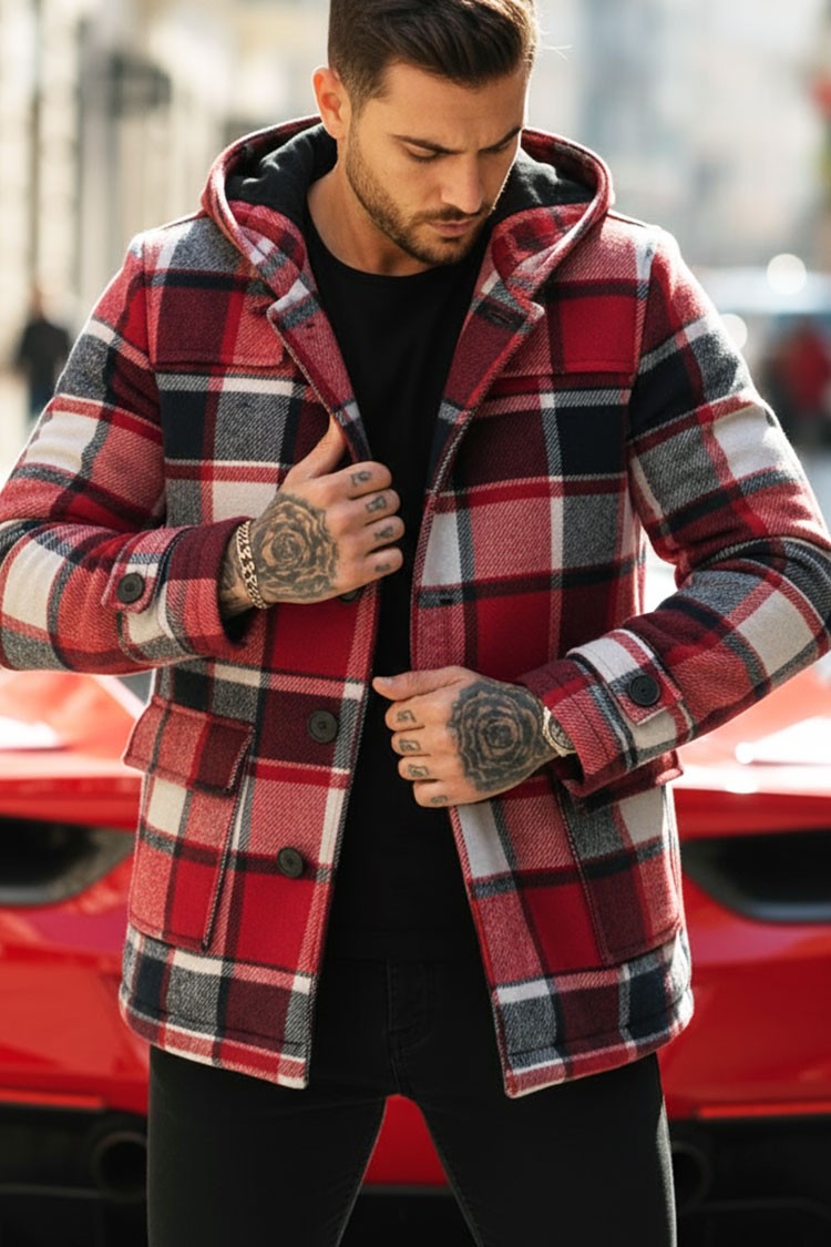 - Praktikus piros férfi kabát kockás mintával, kiváló minőségű és meleg anyagból.