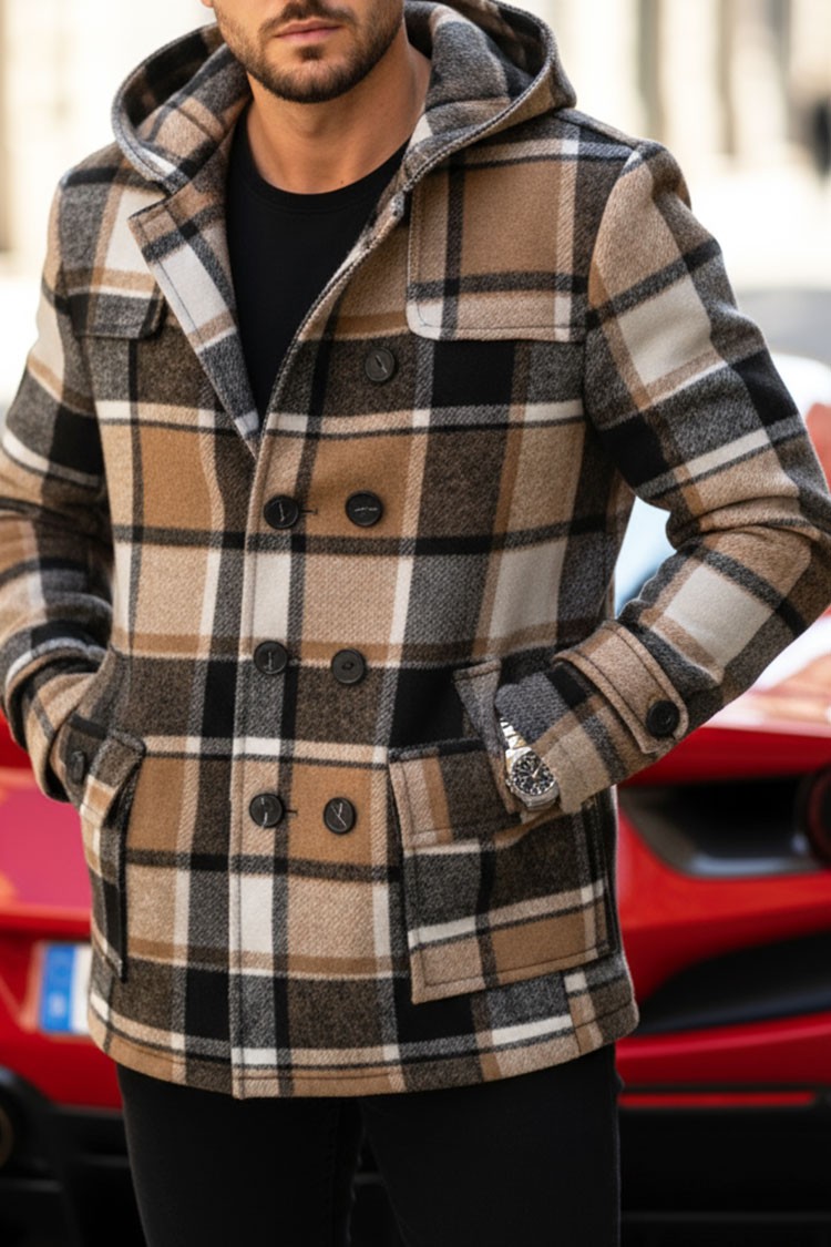 - Praktikus bézs szinű férfi kabát kockás mintával, kiváló minőségű és meleg anyagból.