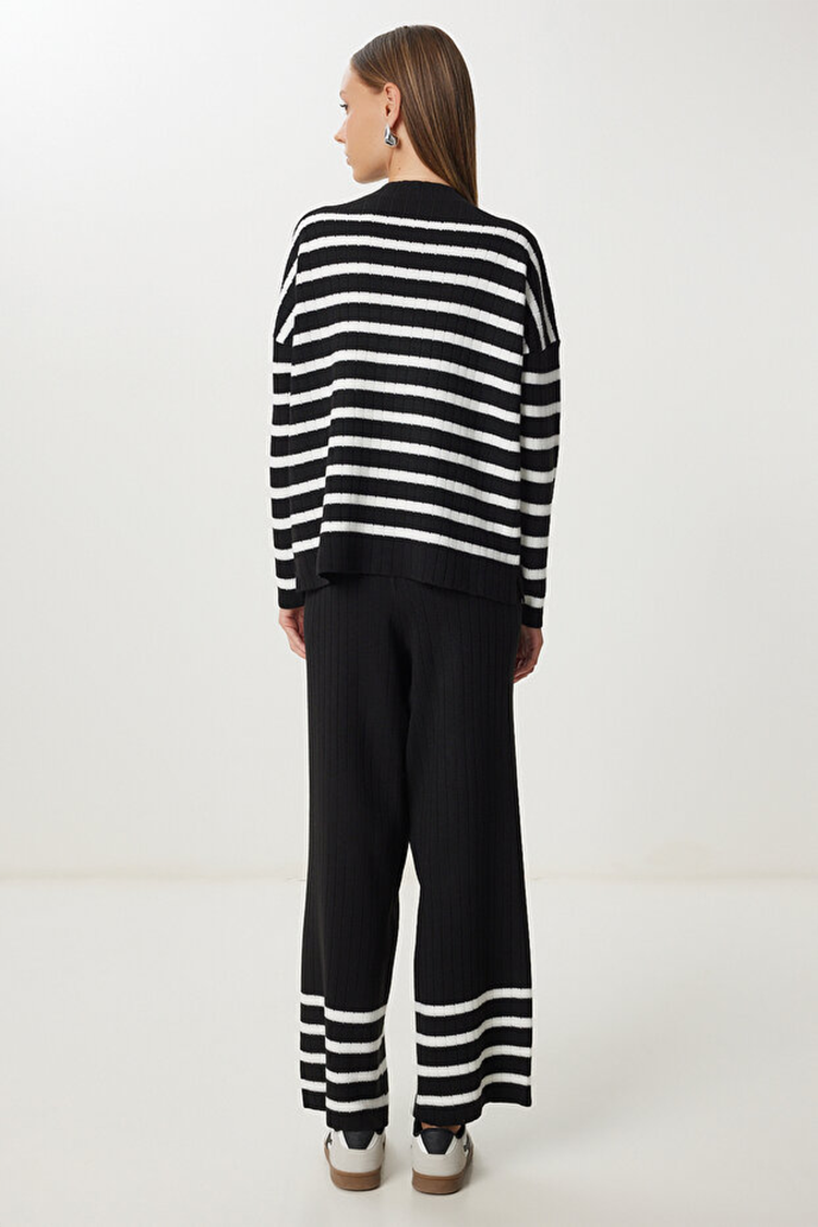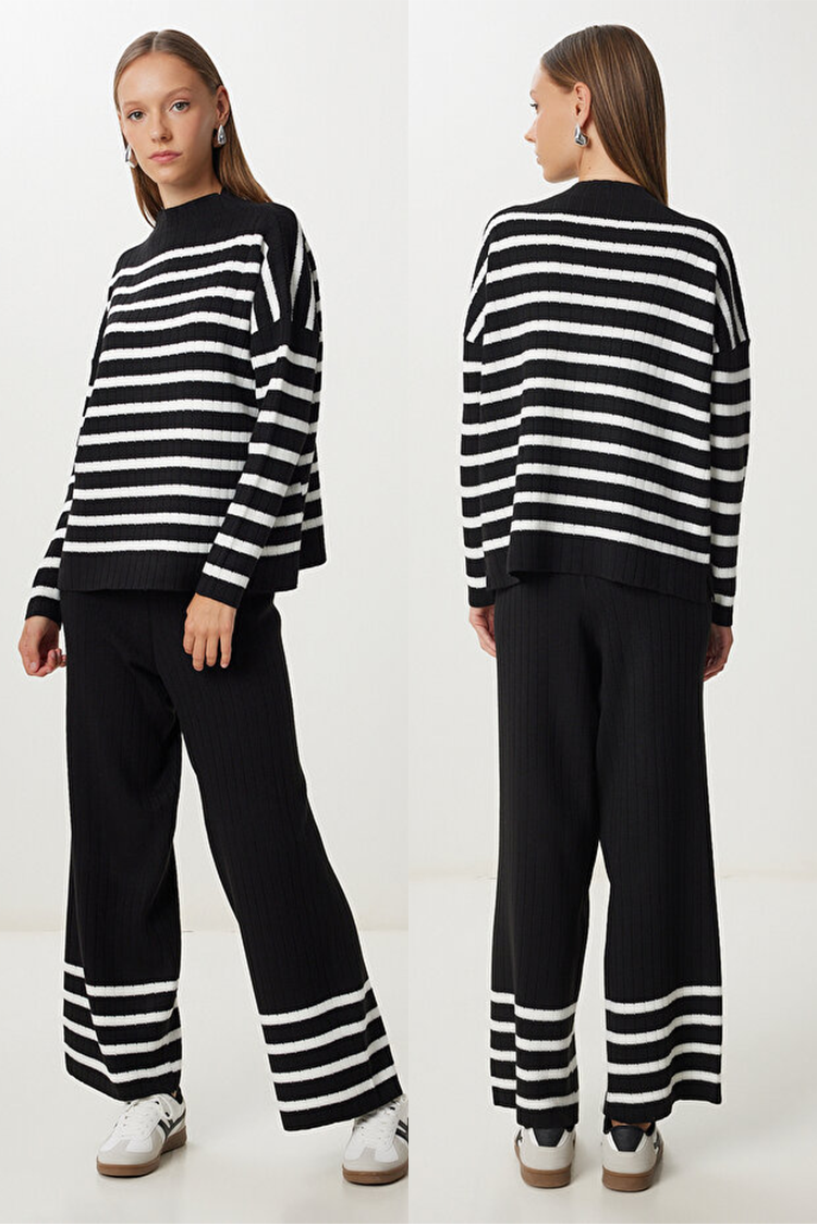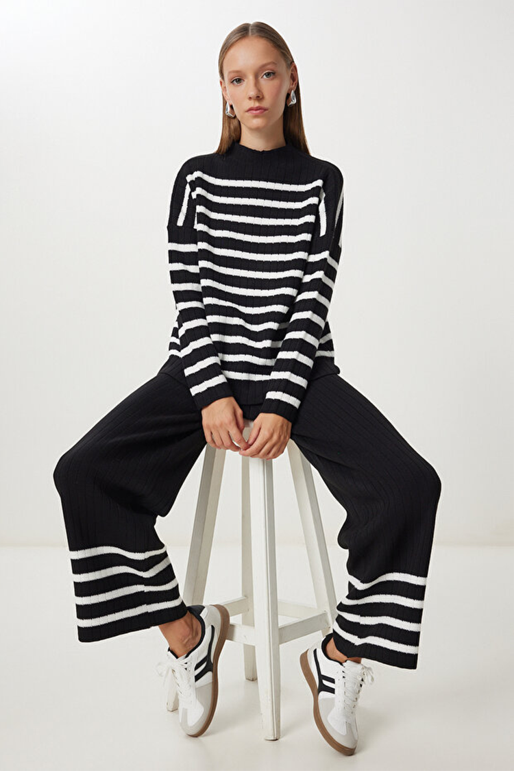 - A felső laza szabású, a nadrág magas derekú és széles szárú.