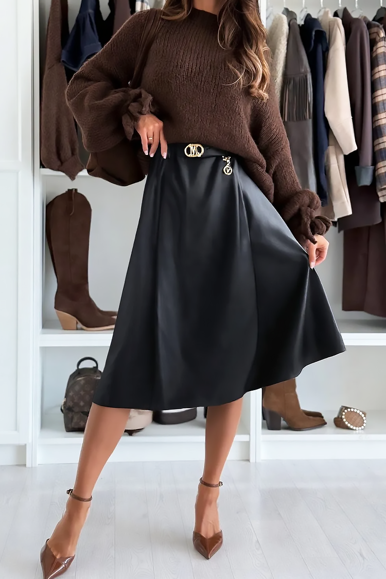 - Stílusos és finom midi szoknya öko bőrből, amely alkalmas különféle divatos alkalmakra.