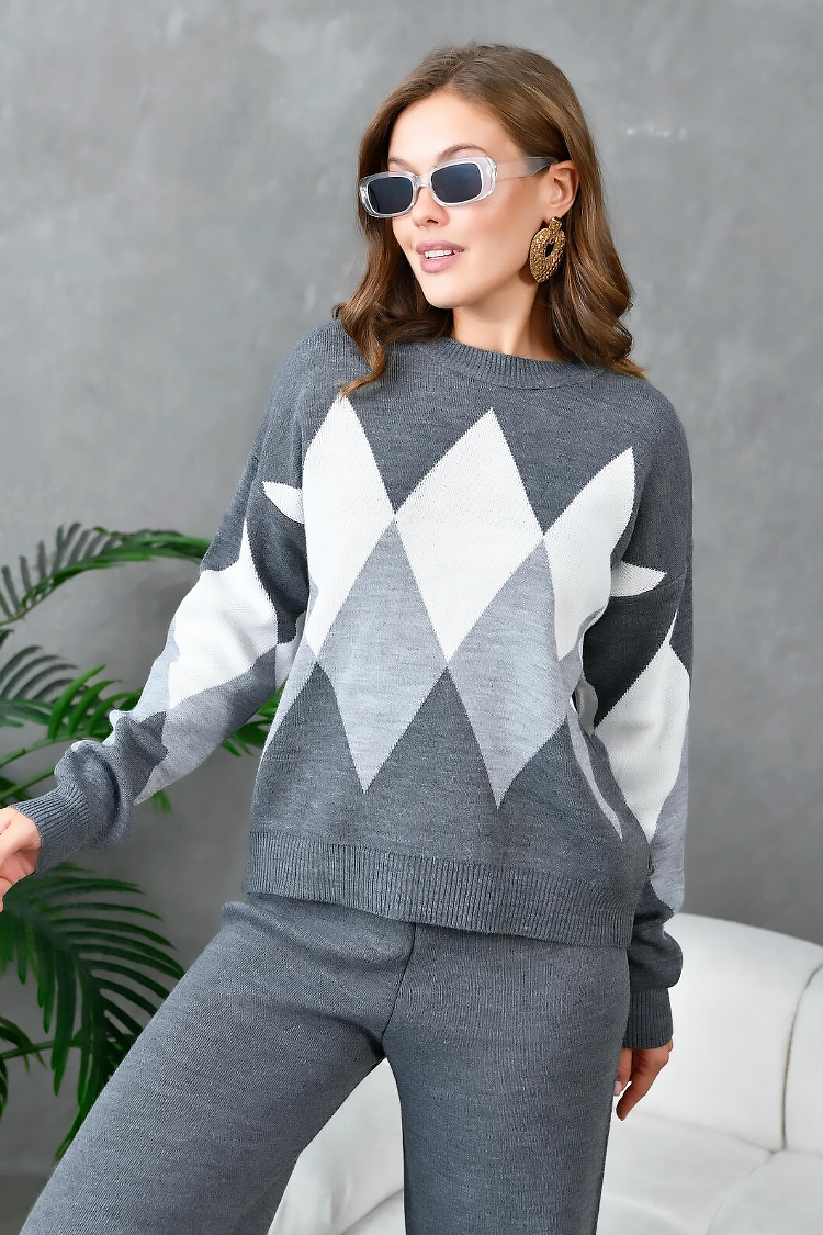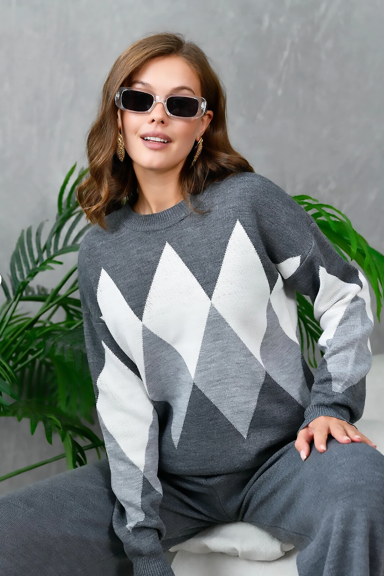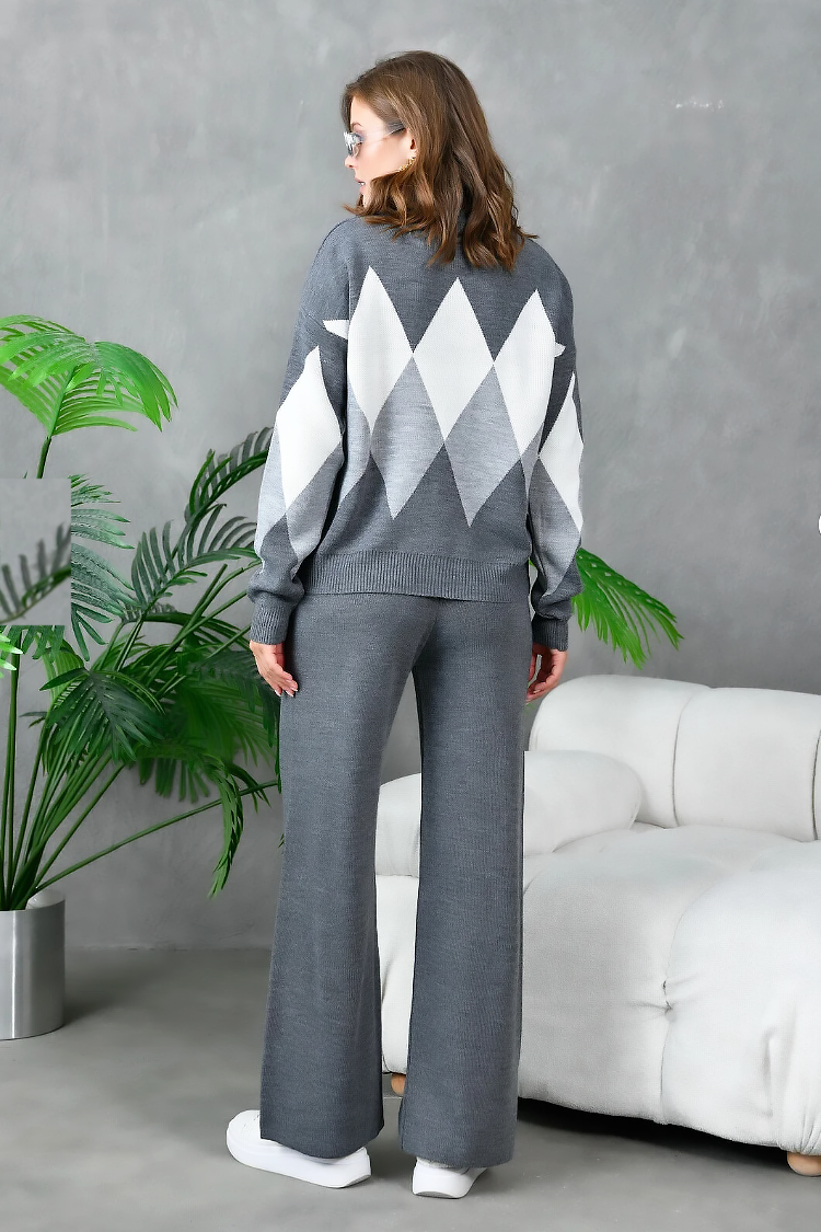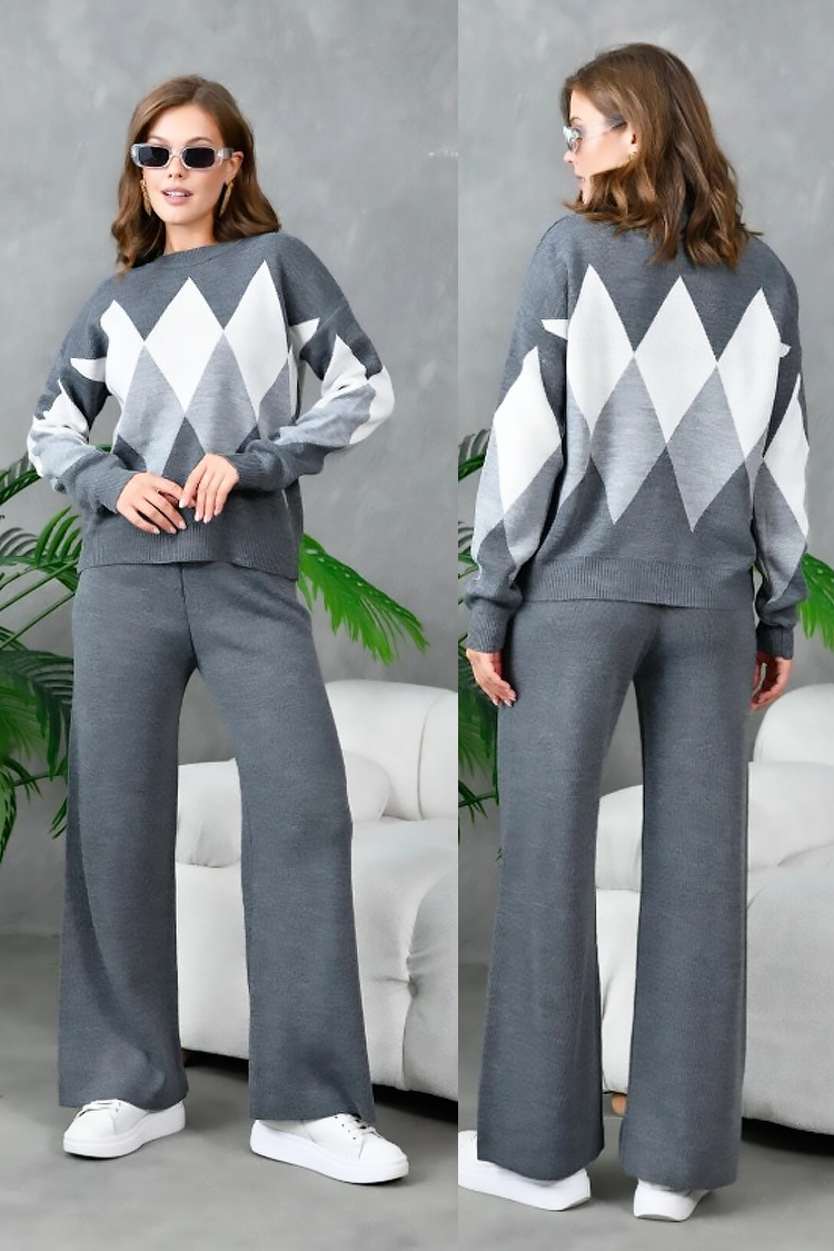 - A felső laza szabású, a nadrág magas derekú és széles szárú.