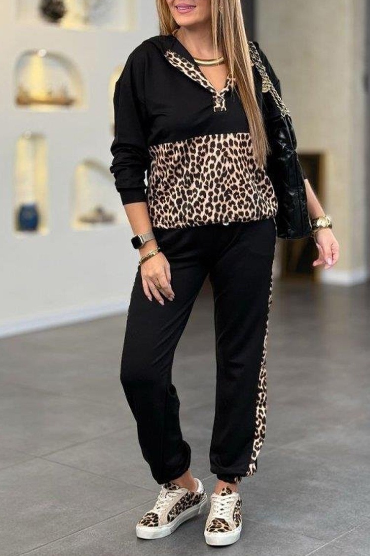 - A pulóver laza szabású és kapucnis, a nadrág pedig magas derekú és gumírozott a szárak végén.