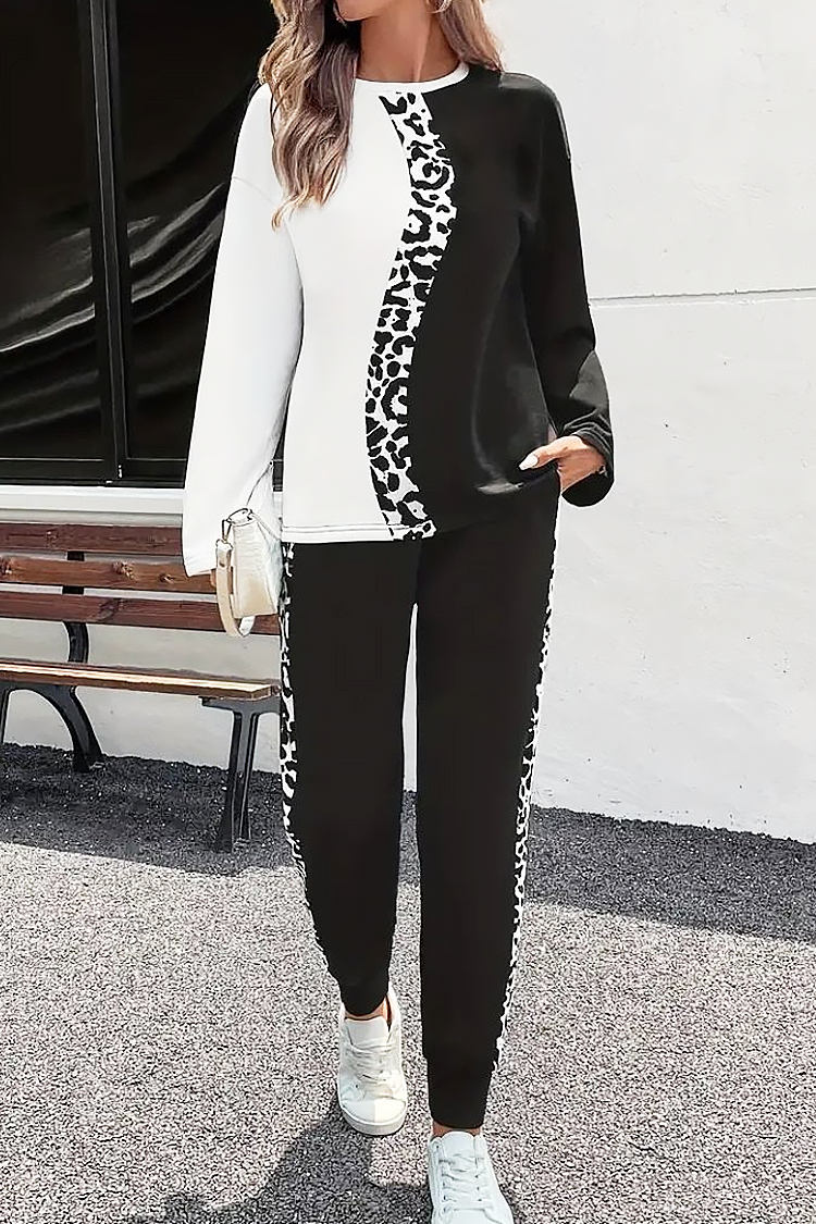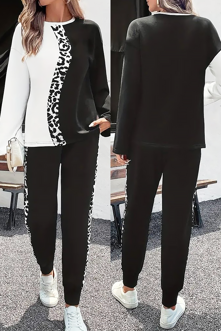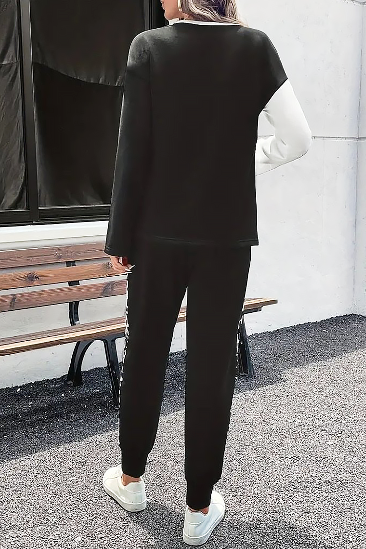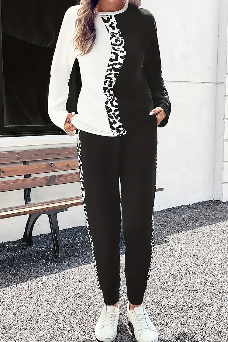 - A pulóver laza szabású és kerek nyakkivágású, a nadrág pedig magas derekú és gumírozott a szárak végén.
