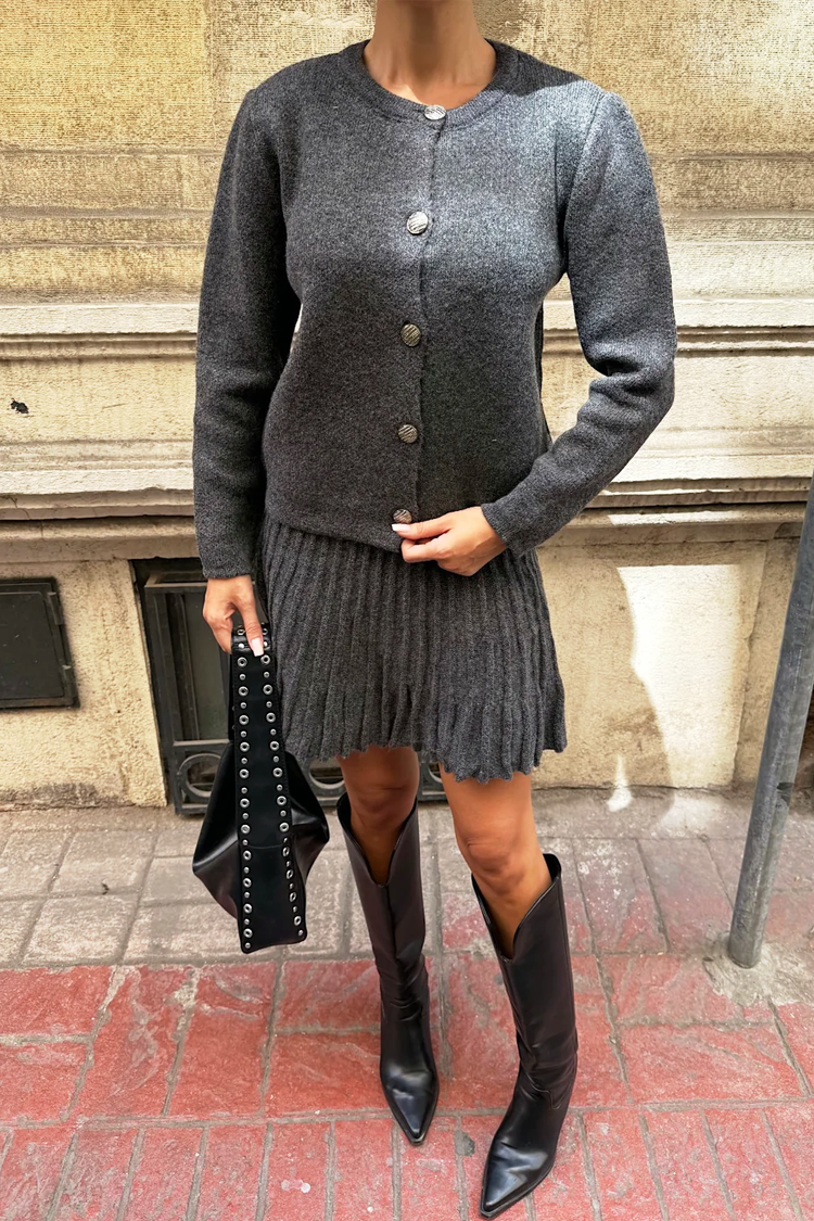 - A kardigán kerek nyakkivágással és elöl látványos gombokkal rendelkezik.