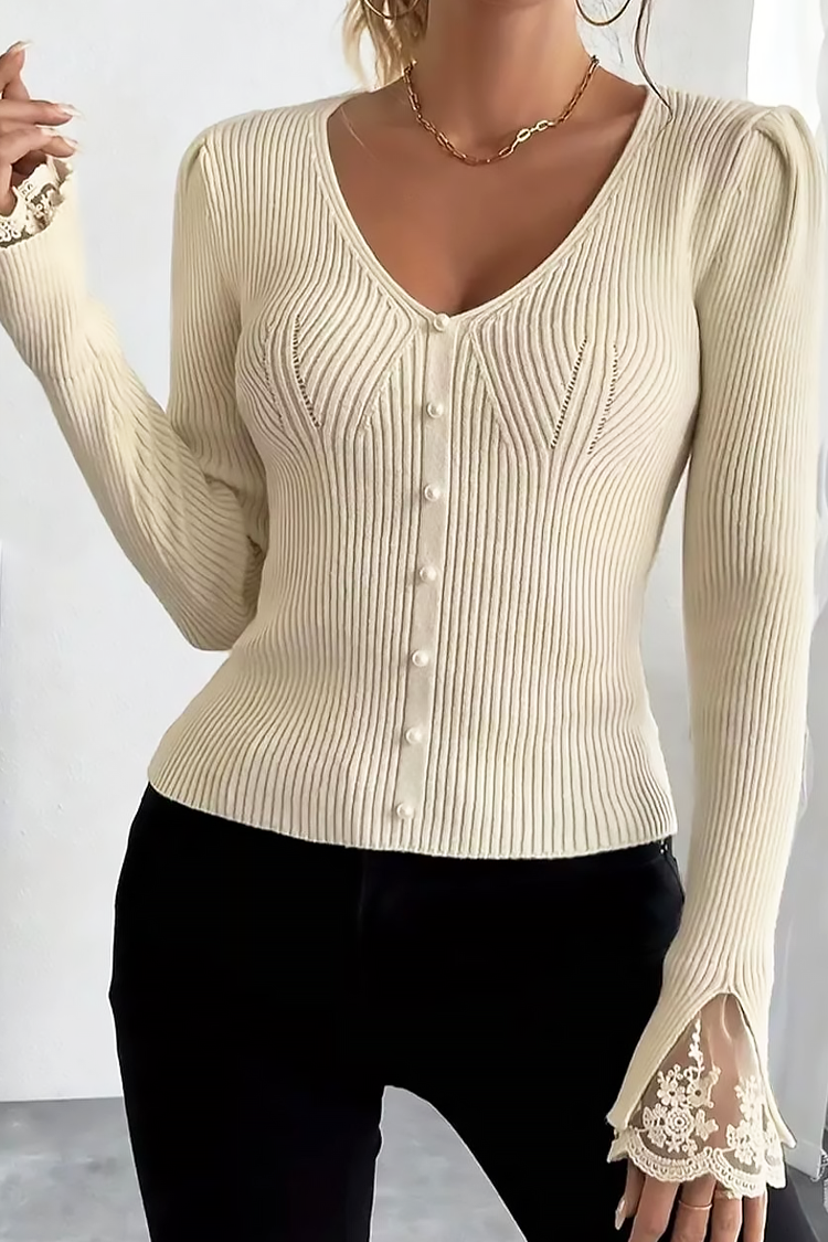 - A felső hosszú ujjú, díszgombos, testhezálló szabású és elegáns csipke díszítéssel rendelkezik.