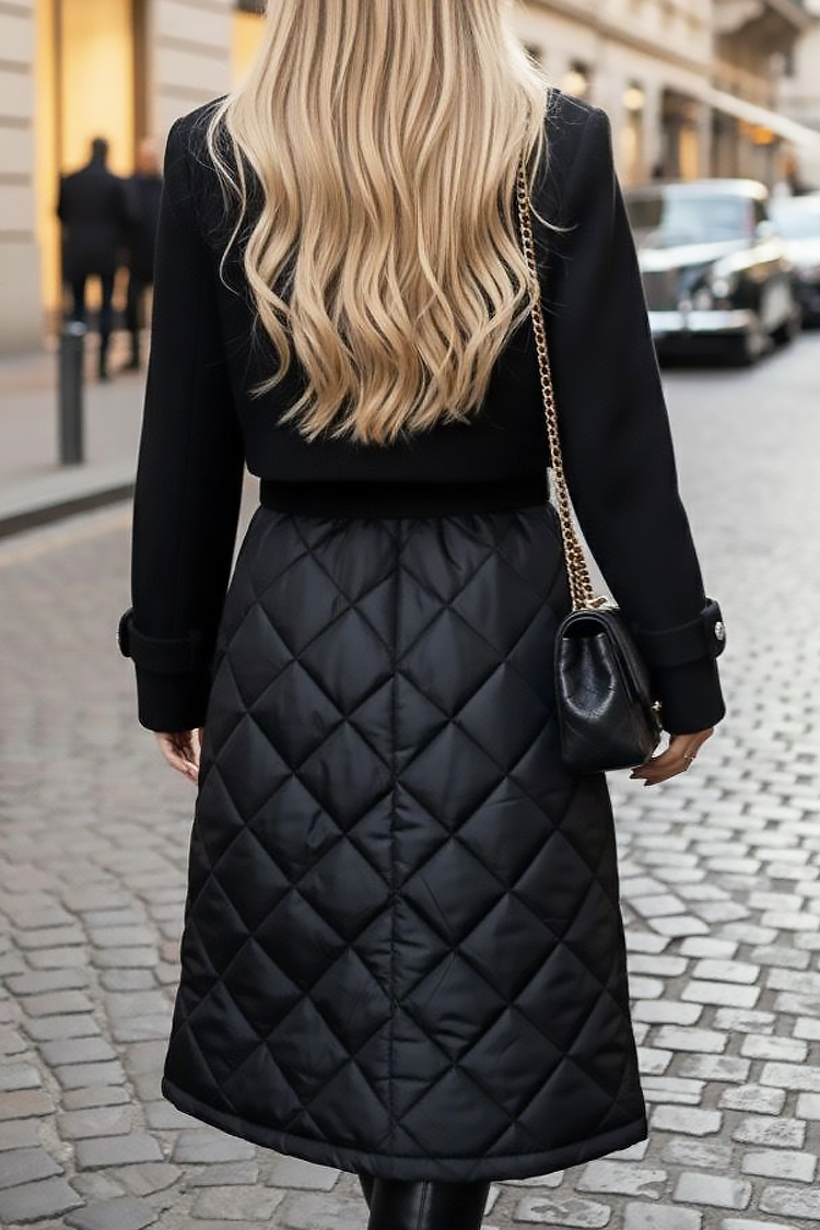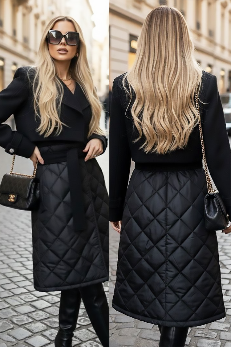 - A modell látványos szabással, elegáns sziluettel, gallérral, mandzsettával és steppelt alsó kialakítással rendelkezik.