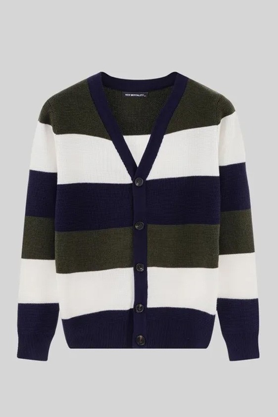 - Praktikus férfi kardigán gombokkal és csíkos mintával, amely alkalmas a mindennapi divatos megjelenéshez.