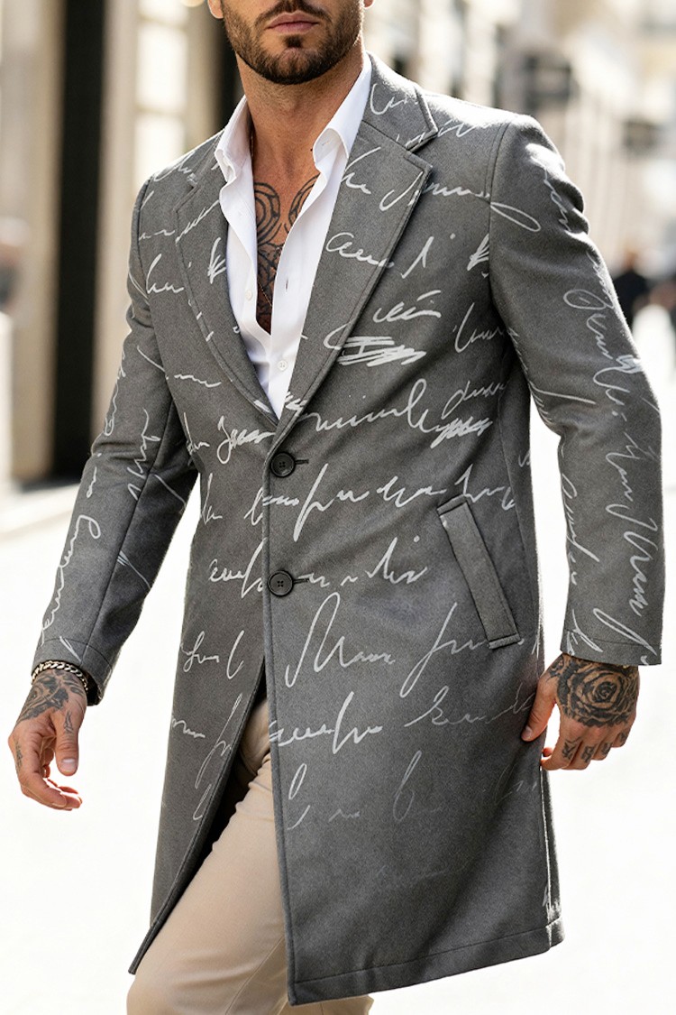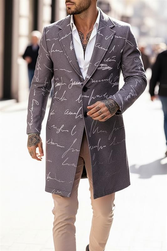 - Elegáns férfi kabát karcsúsitott sziluettel és látványos, kézzel írott mintával.