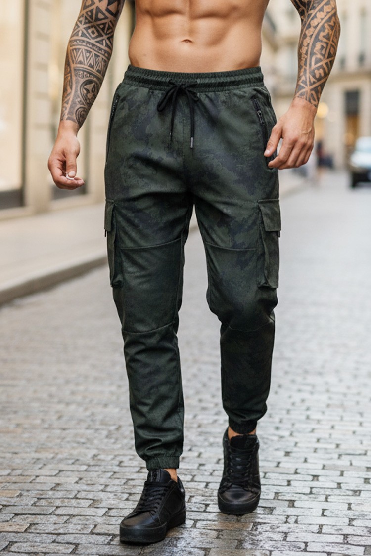 - Férfi cargo nadrág khaki színben és terepszínű mintával, mindennapi használatra.
