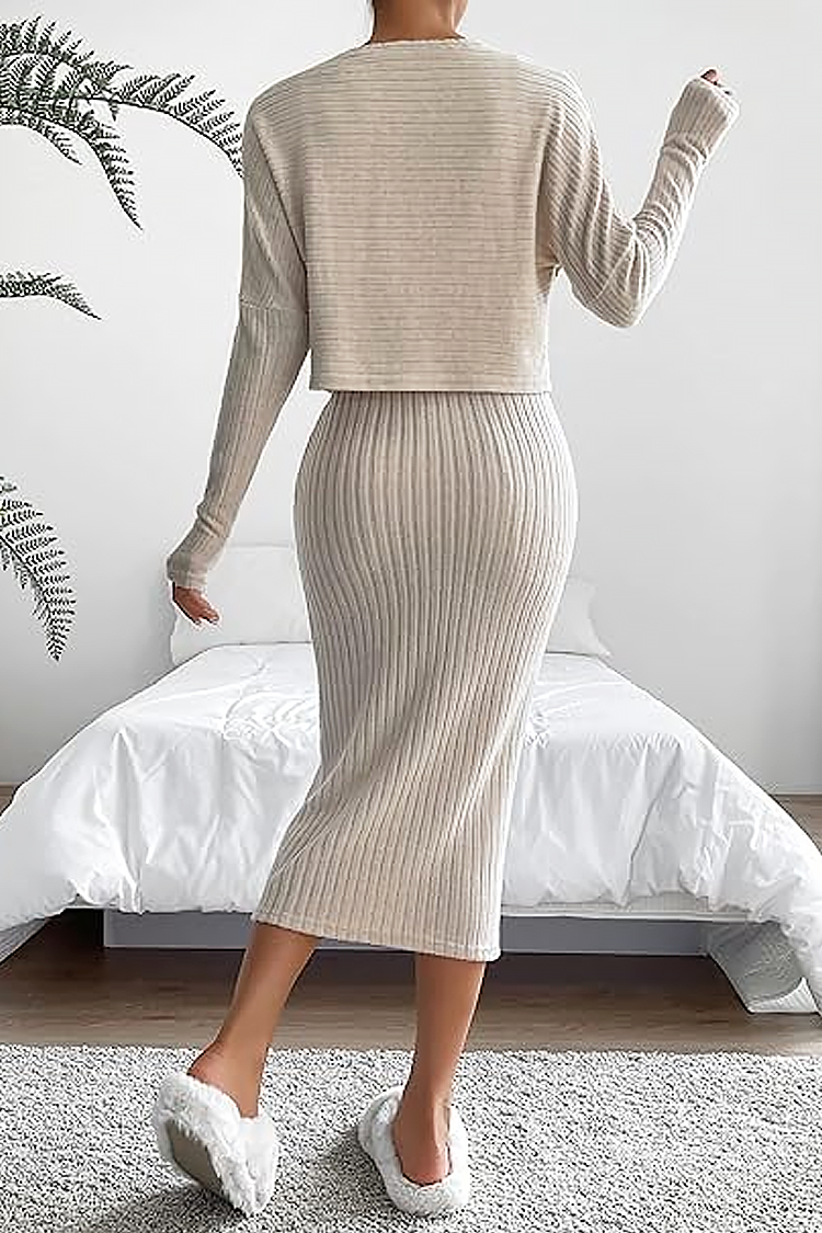 - Modern, bézs színű, kétrészes szett, amely különféle alkalmakra alkalmas.