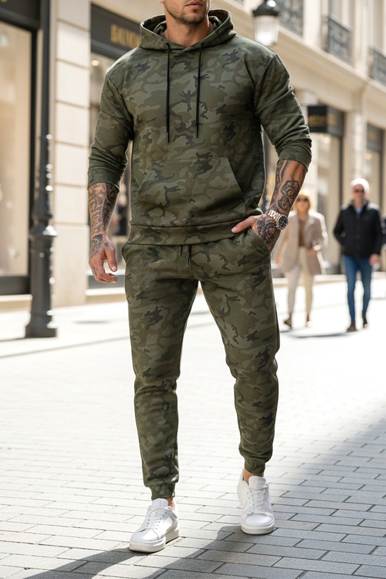 - Kényelmes, kétrészes sportos szett terepszínű mintával, amely egy pulóverből és egy nadrágból áll.