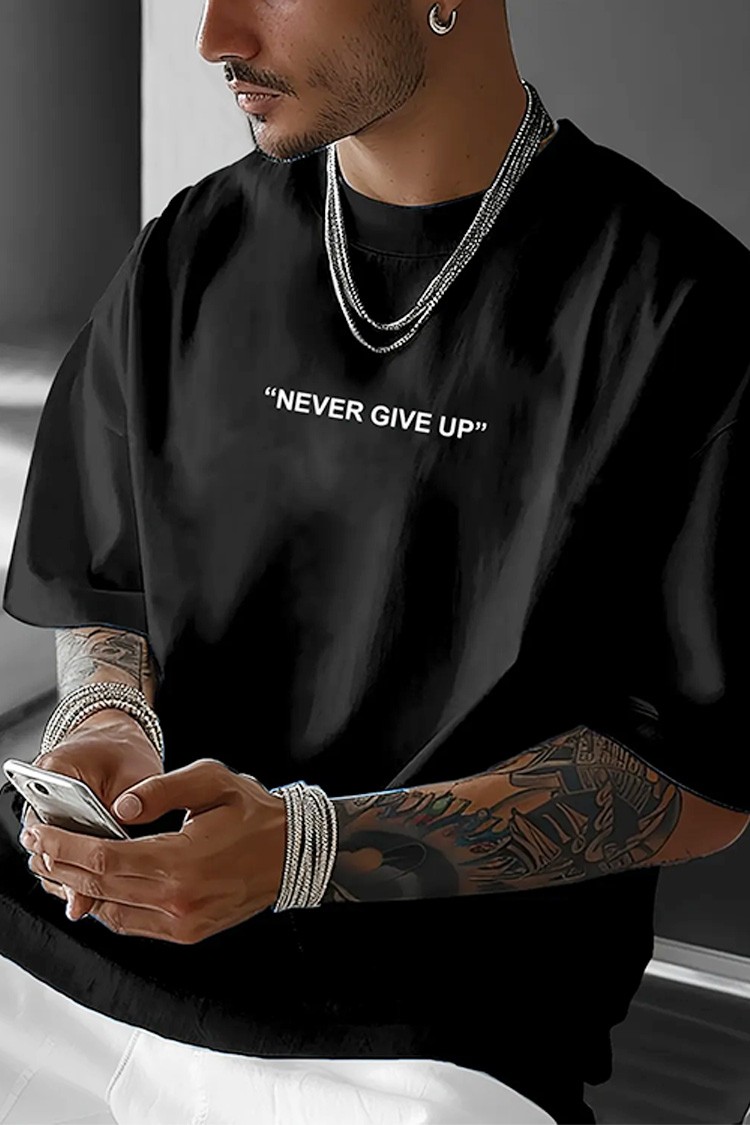- Praktikus férfi póló kényelmes szabással és „soha ne add fel” felirattal, amely alkalmas mindennapi életre, sétákra vagy sportos megjelenés kiegészítéseként.