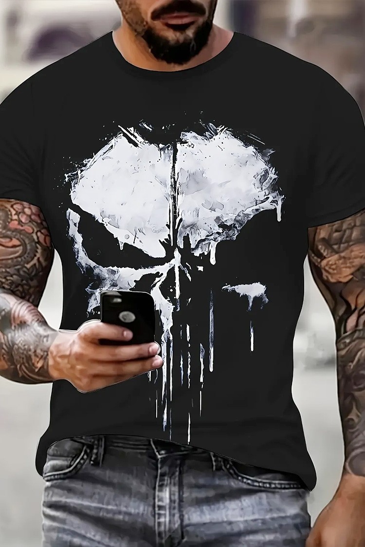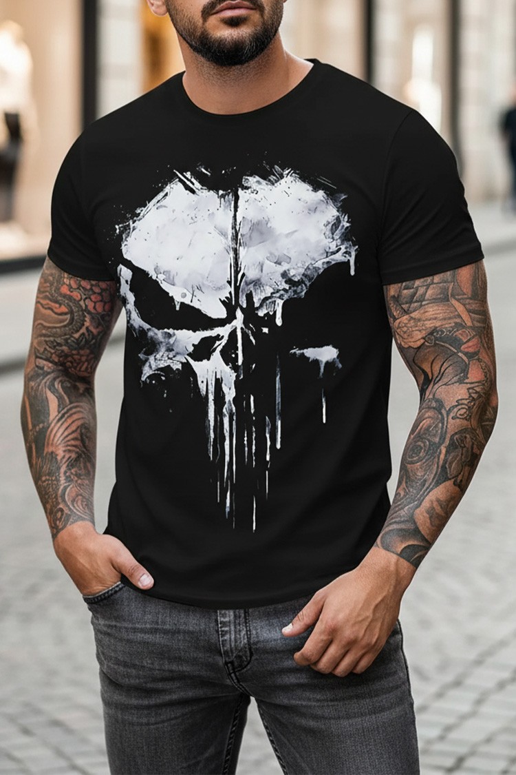 - Praktikus férfi póló kényelmes szabással és koponya mintával, amely alkalmas mindennapi életre, sétákra vagy sportos megjelenés kiegészítésére.