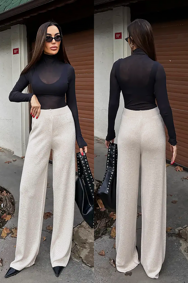 - A modell magas és rugalmas derékkal, egyenes, bő szabással és fényes hatású.