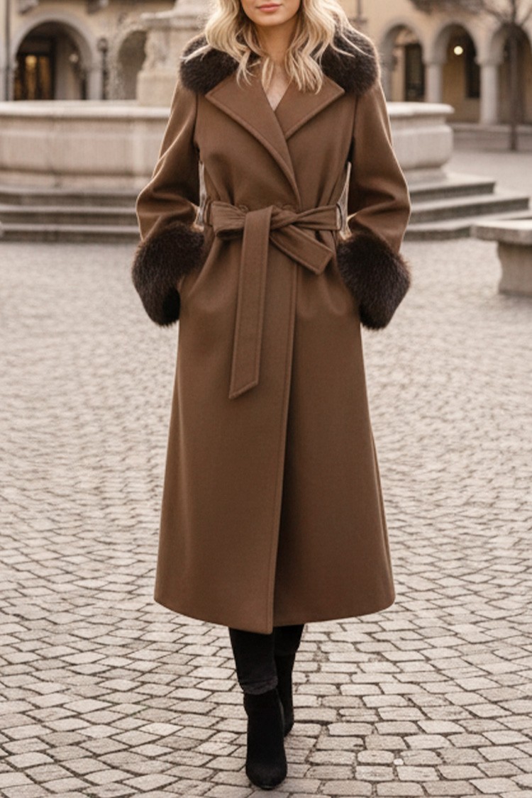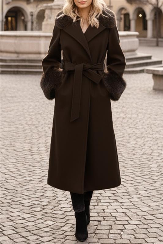 - A modell klasszikus dizájnnal, ugyanabból az anyagból készült övvel és szörme gallérral, mandzsettával rendelkezik.