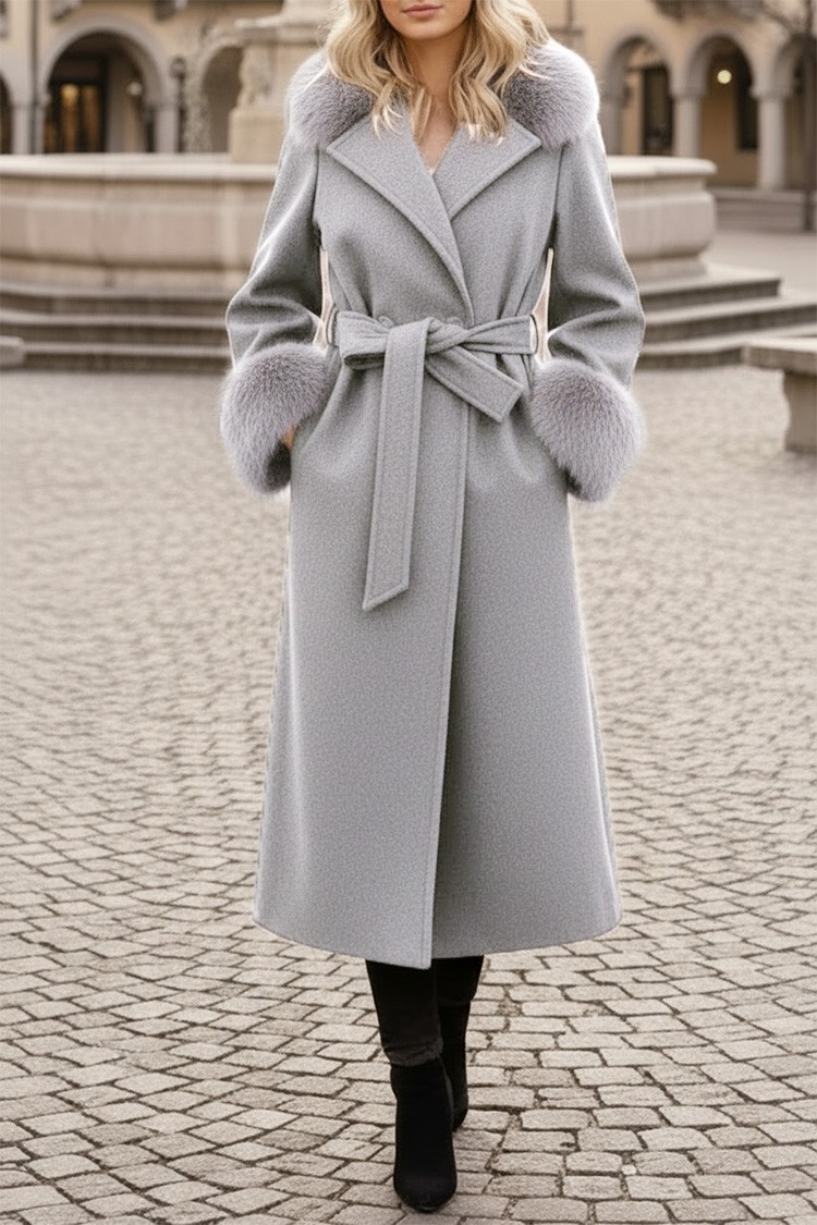 - A modell klasszikus dizájnnal, ugyanabból az anyagból készült övvel és szörme gallérral, mandzsettával rendelkezik.