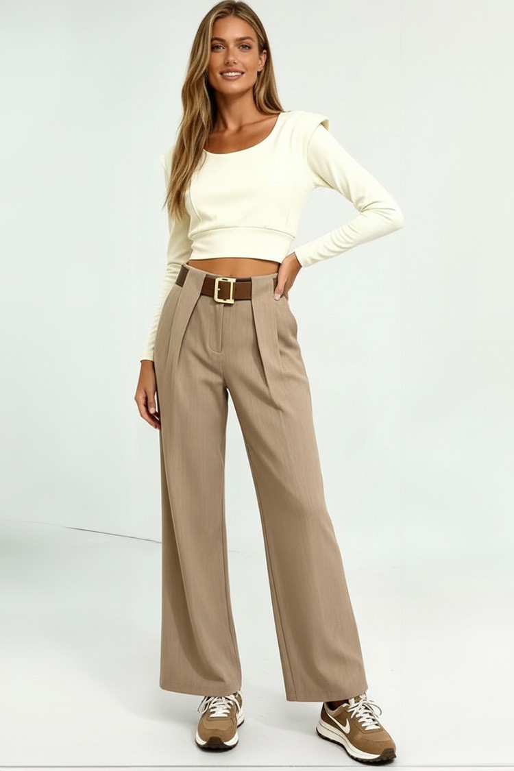 - A modell magas és látványos derékkal, egyenes szabással és öko bőrből készült övvel rendelkezik.
