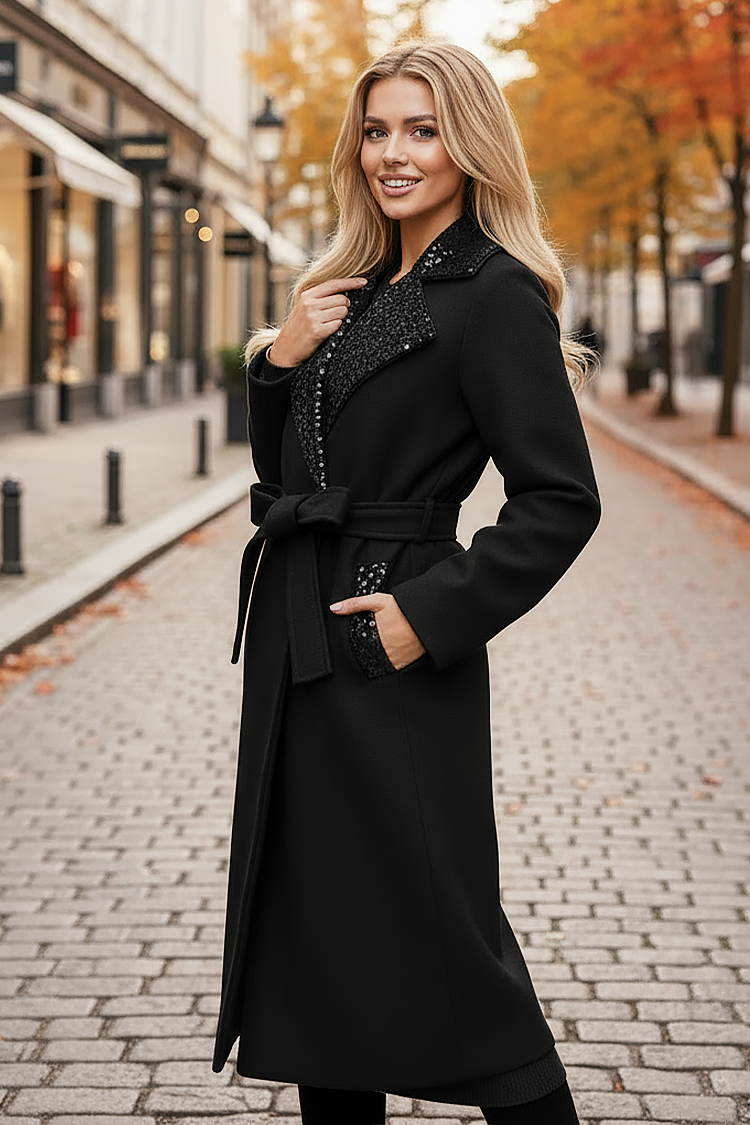 - A modell klasszikus dizájnnal rendelkezik, ugyanabból az anyagból készült övvel és csillogó díszítésekkel a gallér és a zsebek körül.
