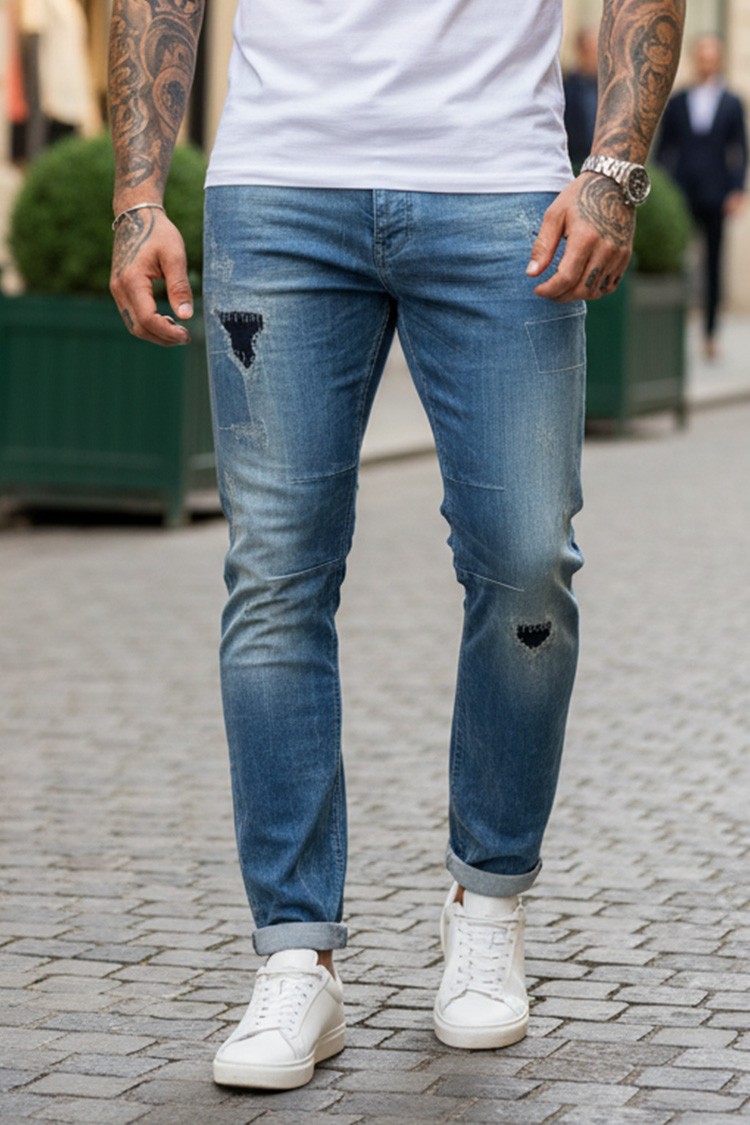 - Pamut farmerből készült a nagyobb kényelem érdekében. Cipzárral és gombbal rögzíthető. A modell felhajtott szárral rendelkezik a lazább megjelenés érdekében.