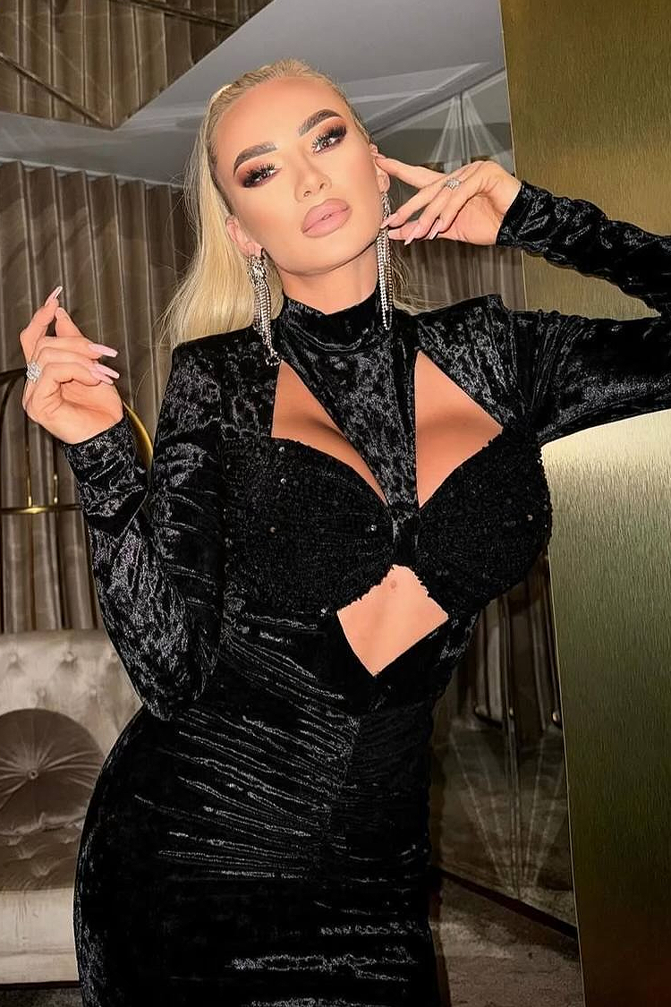 - A ruha testhezálló, szexi szabású, hosszú ujjú és szexi dekoltázsú.