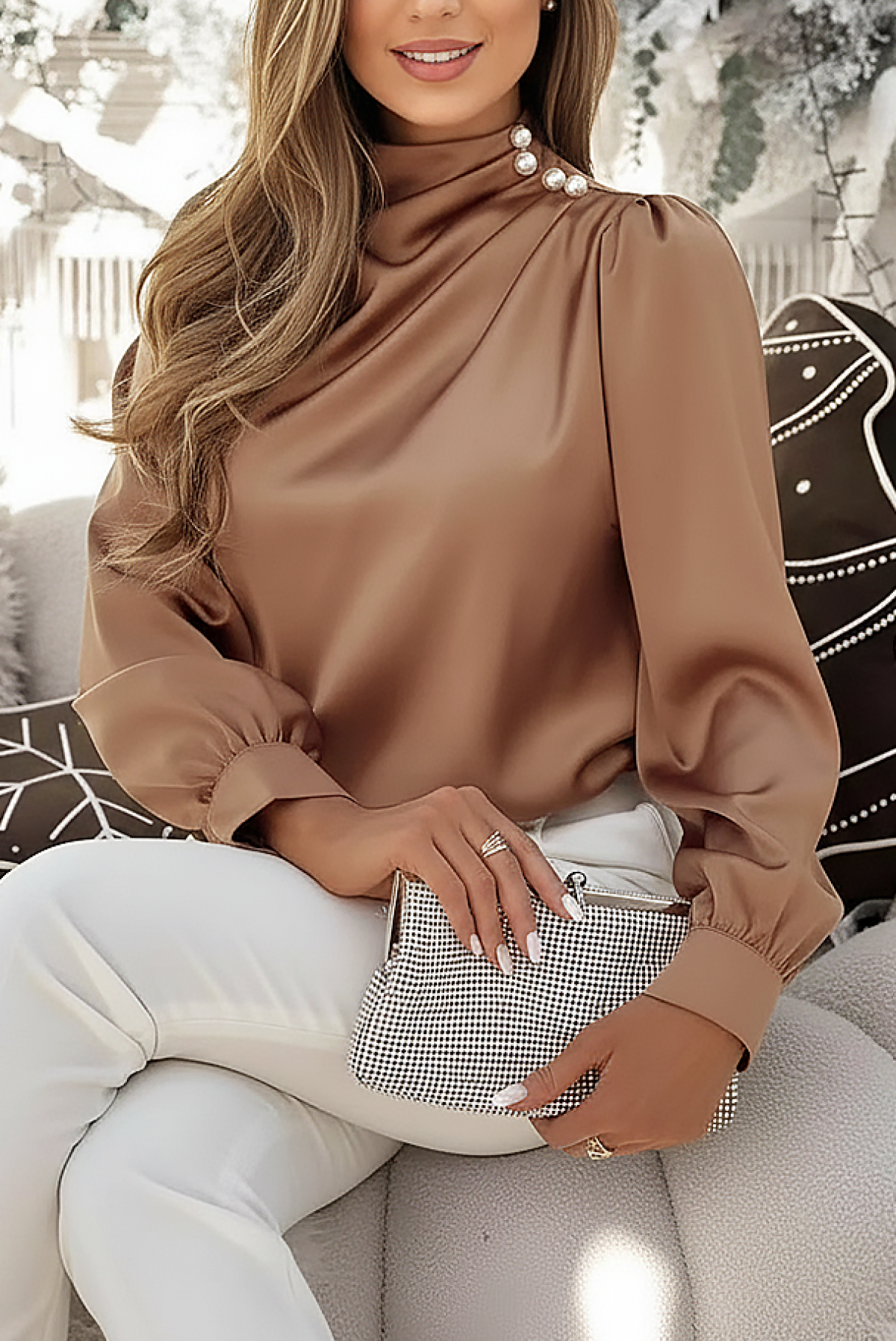 - A blúz hosszú ujjú, elegáns szabású és díszgyöngyökkel a vállon.