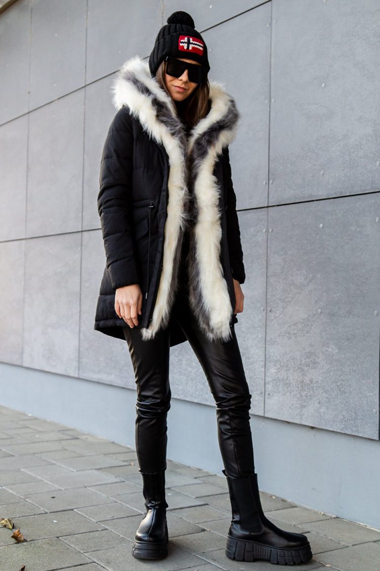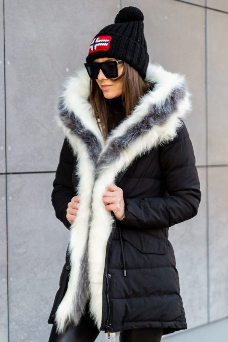 - A modell kényelmes szabással, cipzárral és gombbal záródik, valamint kapucnival, teljes hosszában szörmével.