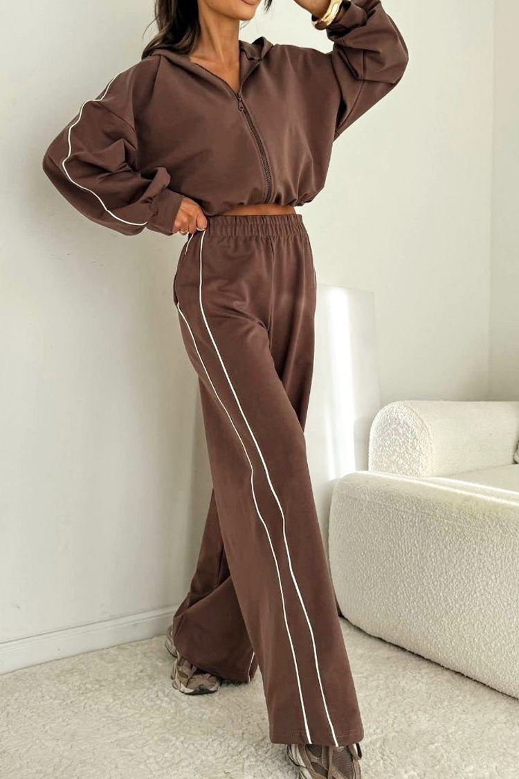 - A kardigán cipzáras és kapucnis, a nadrág pedig magas derekú és széles szárú.