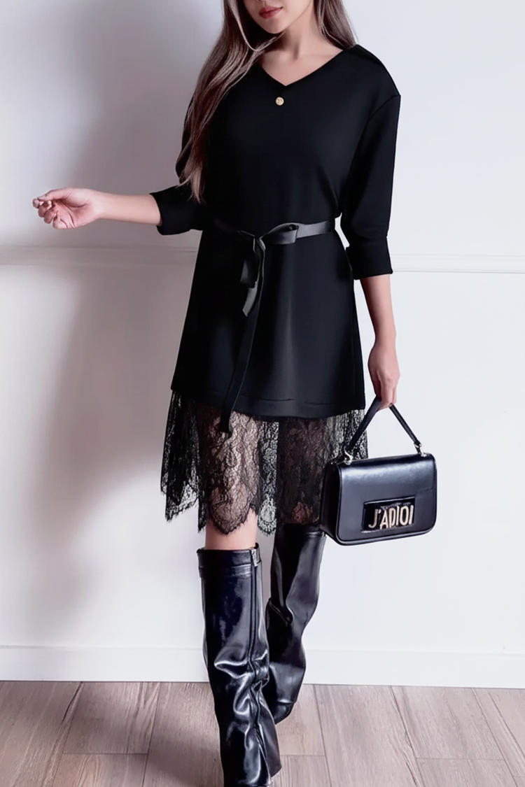 - A modell alján finom csipke, textil öv és V-nyak található.