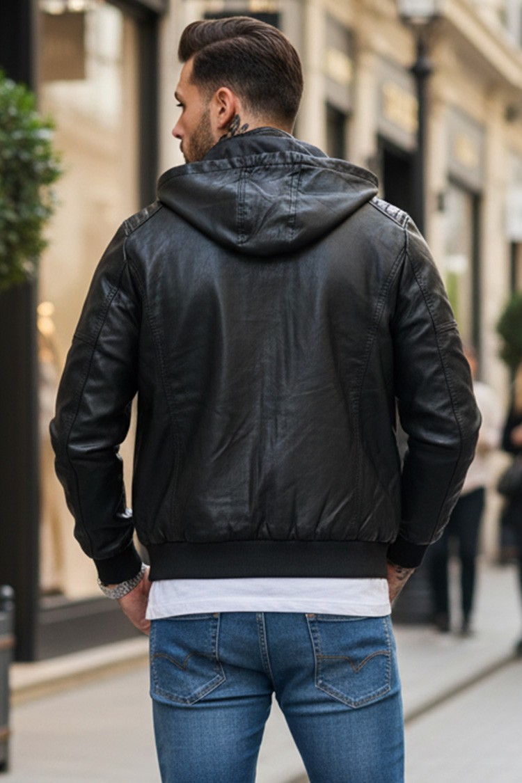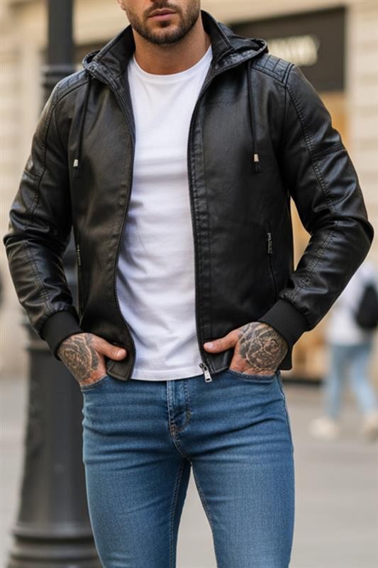 - Férfi dzseki vállvédőkkel és kapucnival, megkötővel, fekete színben, mindennapi használatra.
