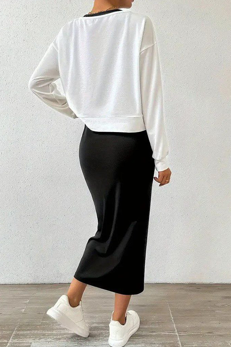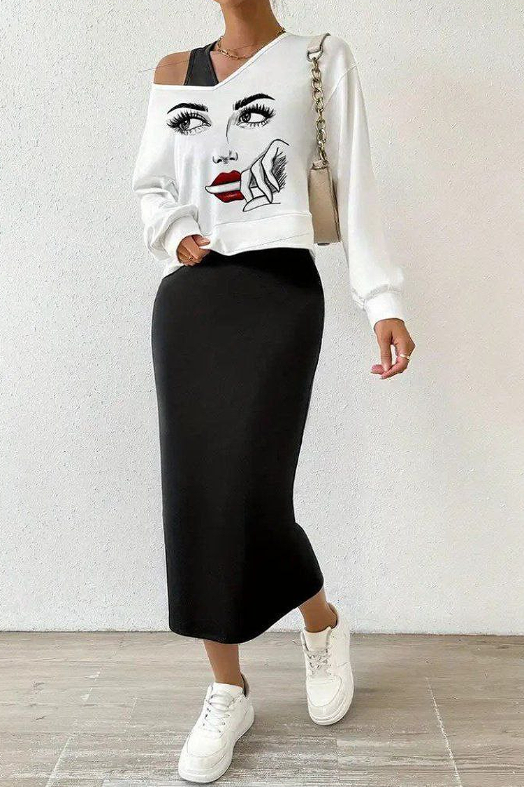 - A ruha klasszikus fekete színű, a felső pedig hatásos, ejtett vállal és színes mintával rendelkezik.