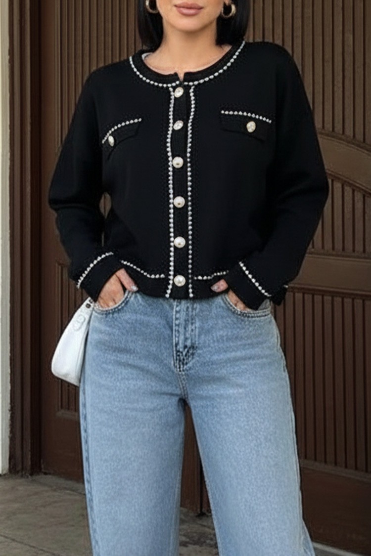 - Elegáns fazonú, hosszú ujjú, látványos gombokkal, díszes zsebekkel és fehér részletekkel rendelkezik.