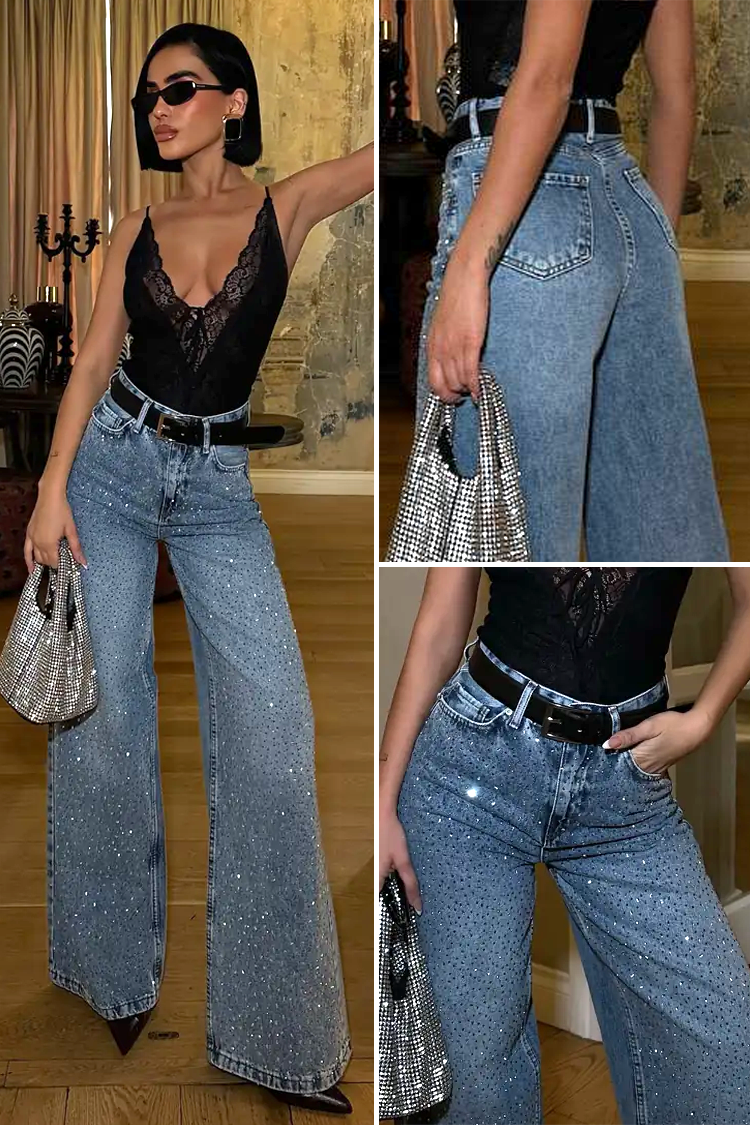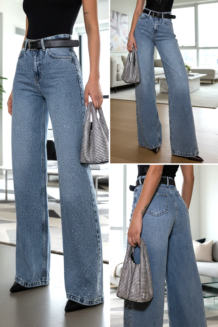 - A modell magas derekú, széles szárú és csillogó díszítő elemekkel rendelkezik.