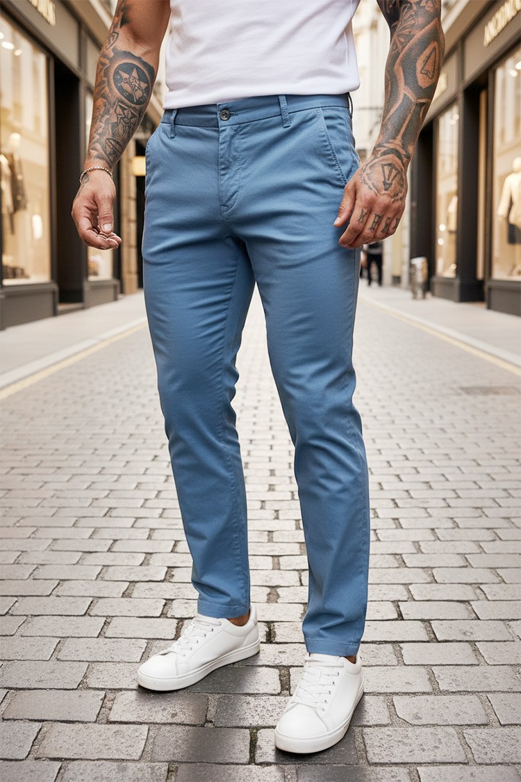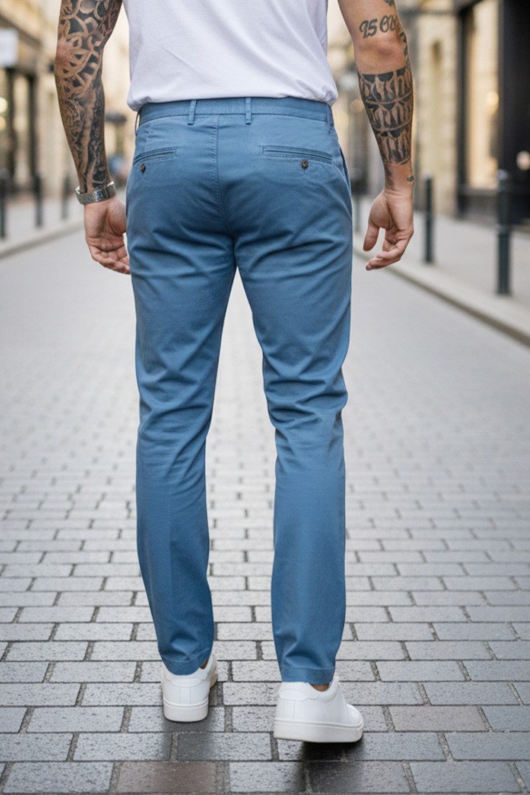 - Férfi nadrág alapmodell egyenes szárral, klasszikus világoskék színben, mindennapi és elegánsabb öltözékhez egyaránt alkalmas.