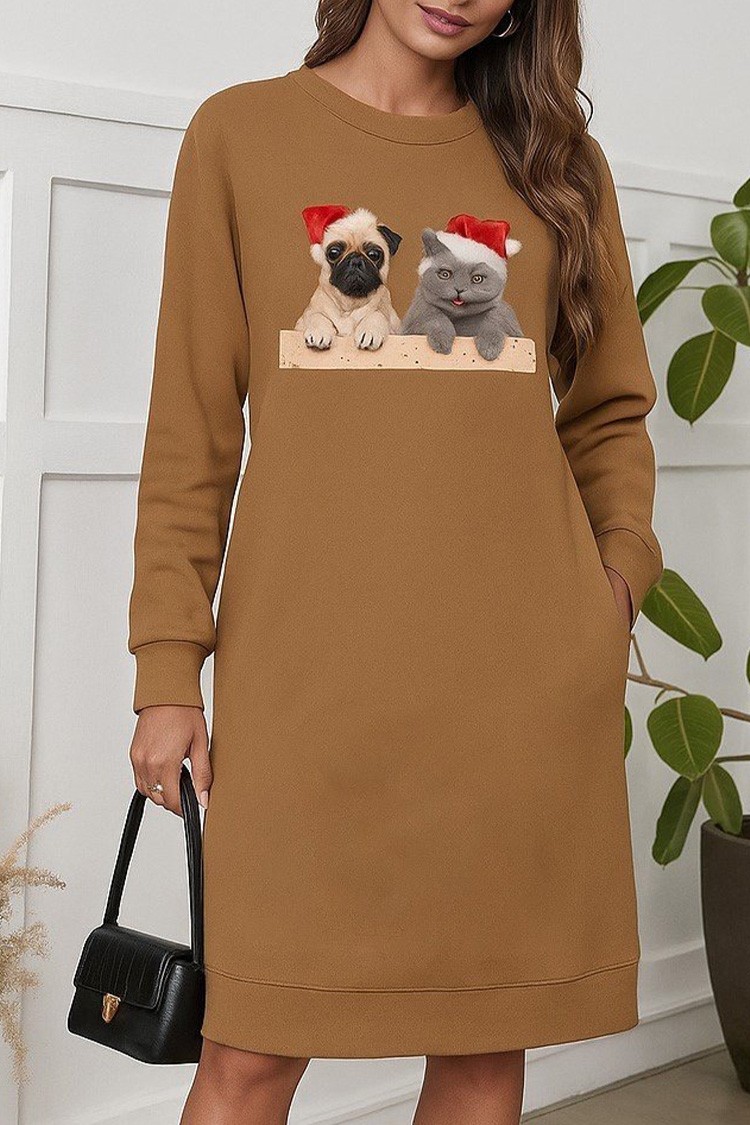 - A ruha kényelmes és laza szabású, hosszú ujjú és karácsonyi mintás.
