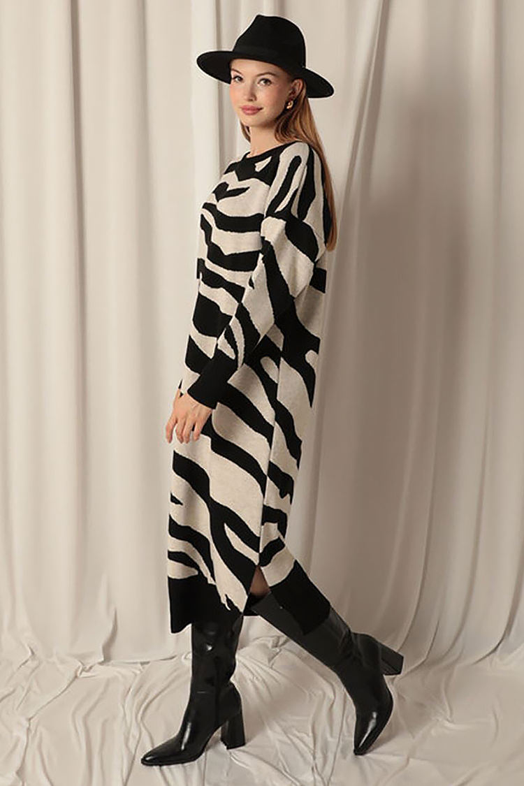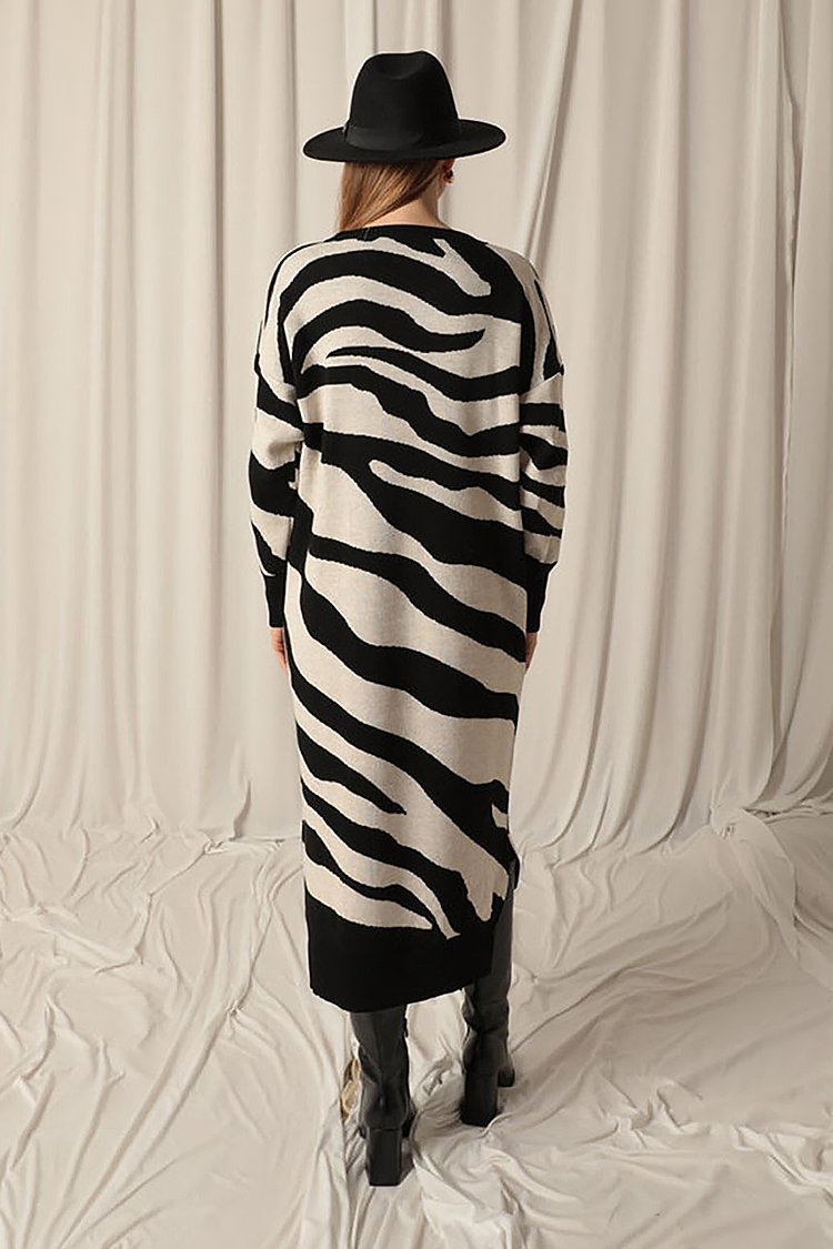 - A modell klasszikus és bő szabású, hosszú ujjú és zebra mintás.
