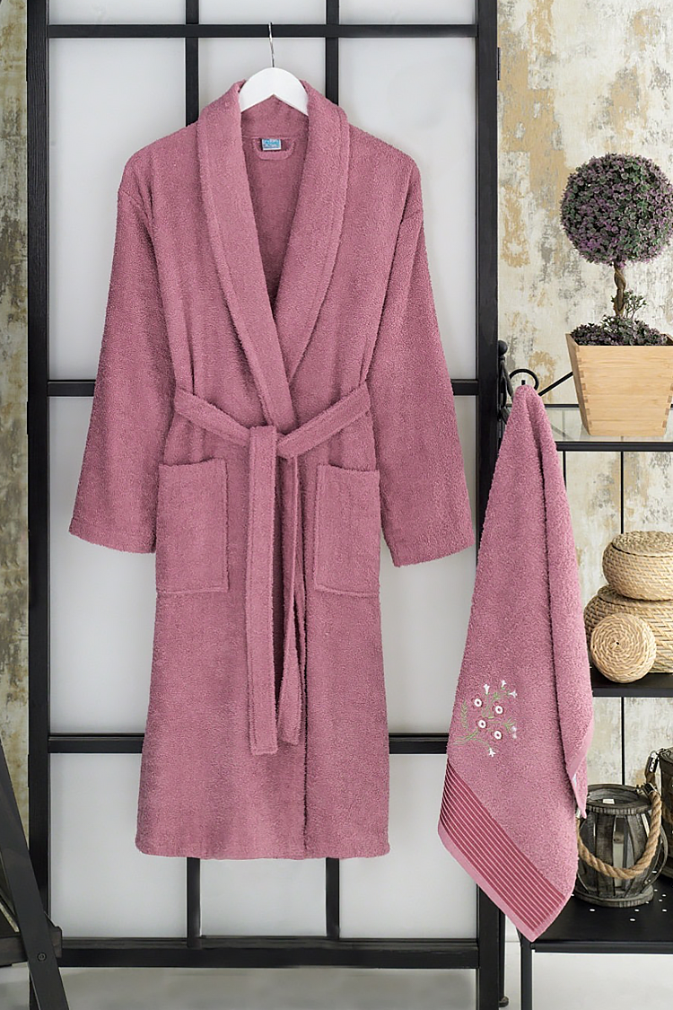 - A fürdőköpeny kényelmes szabással, övvel és praktikus zsebekkel rendelkezik az elején. A törölköző gyönyörű hímzéssel rendelkezik, azonos színű.