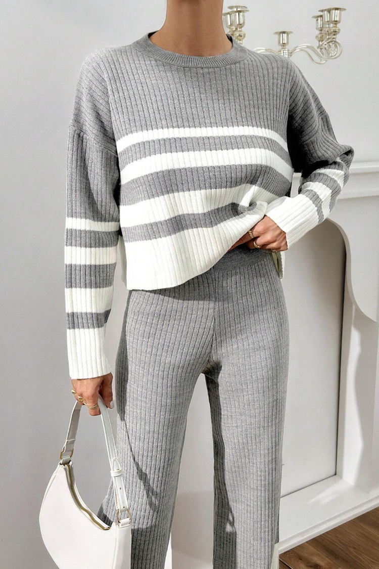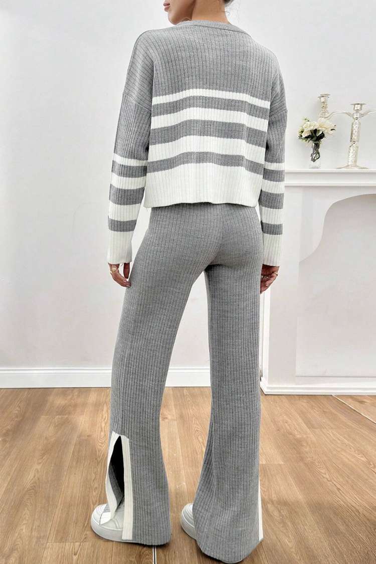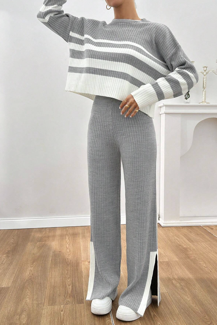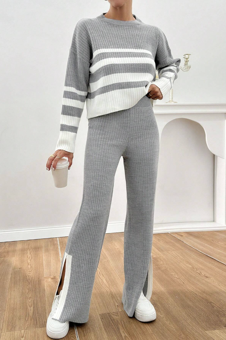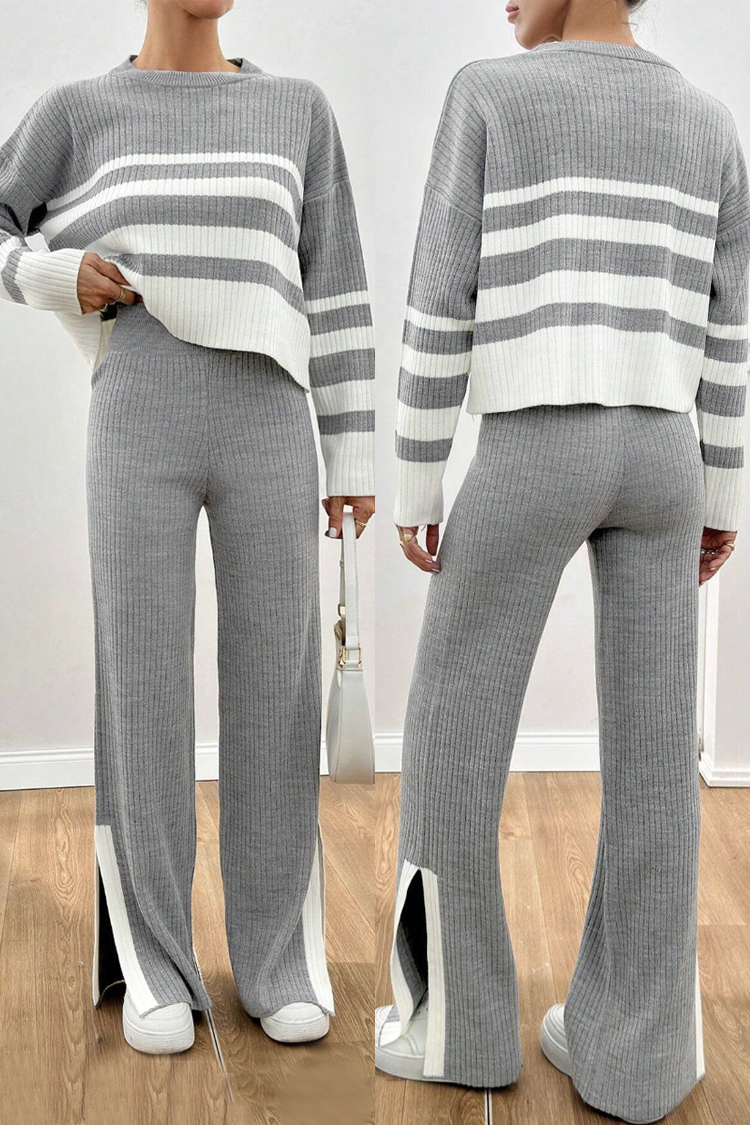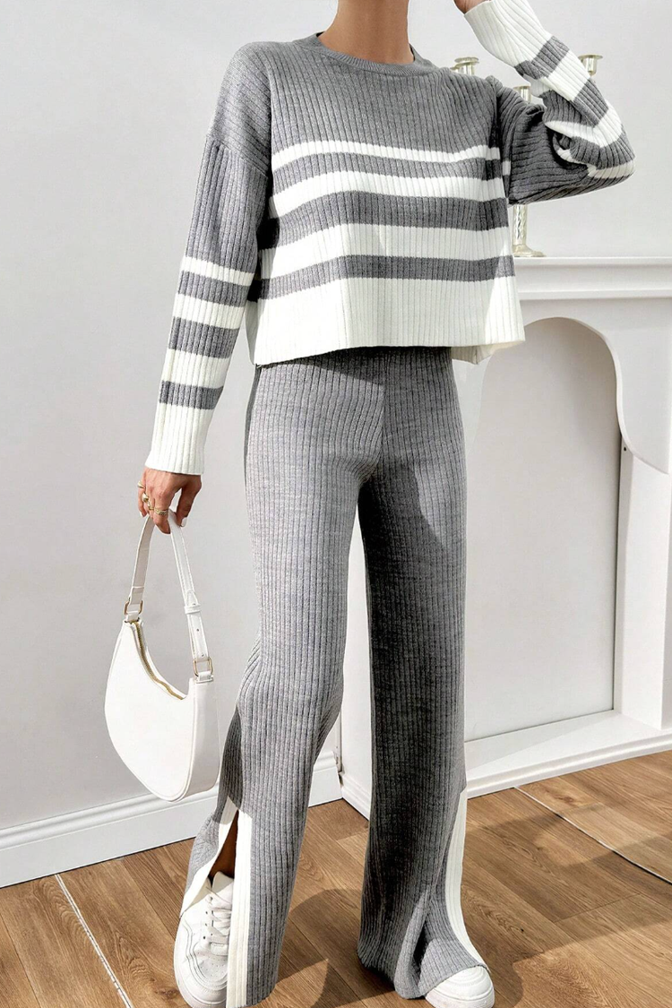 - A pulóver klasszikus szabású, a nadrág pedig magas derekú és látványos szárú.