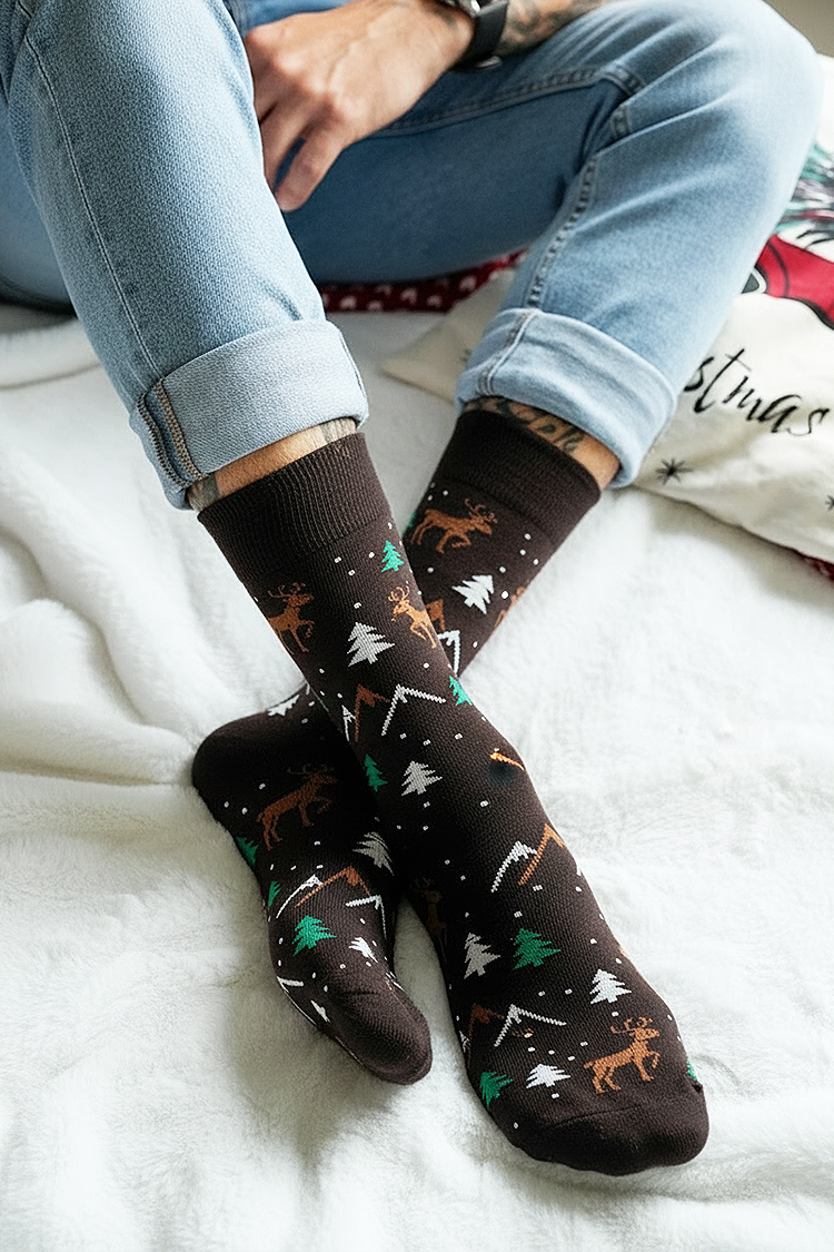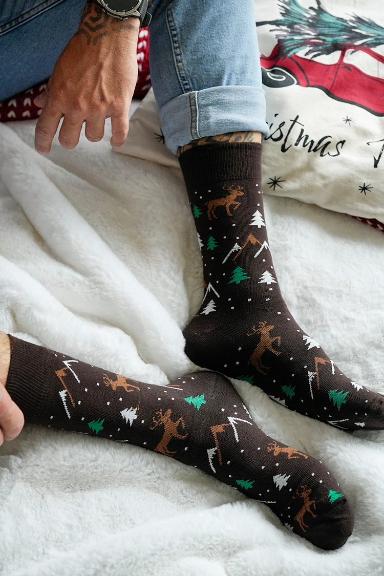- Férfi barna zokni karácsonyi motívumokkal és rugalmas széllel.