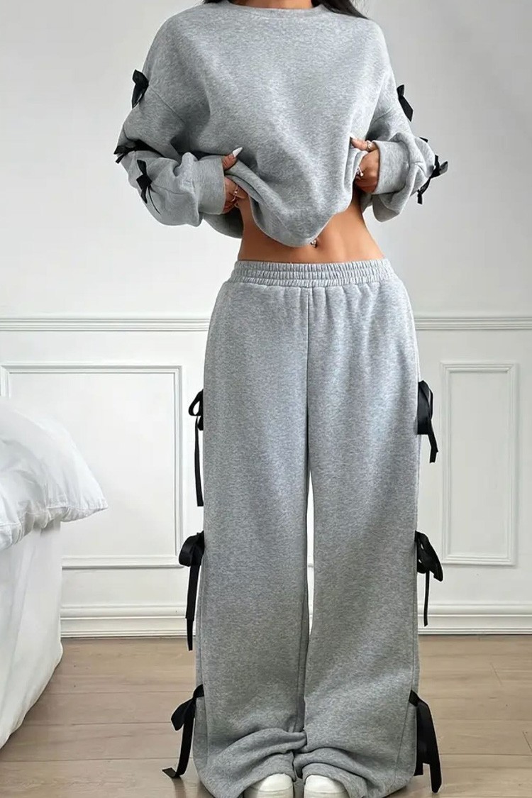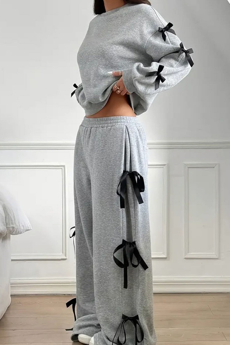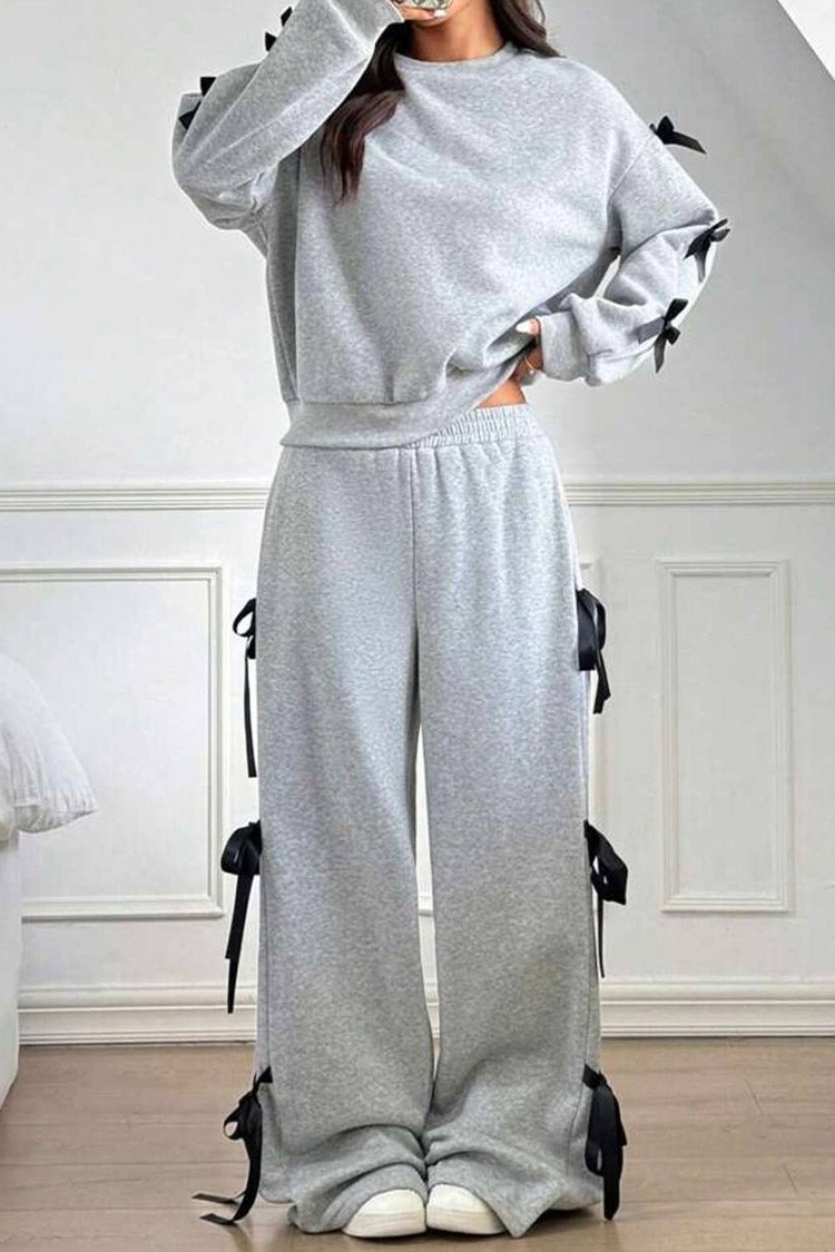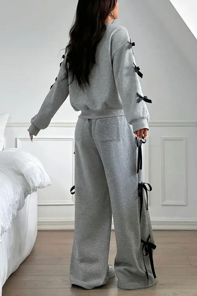 - A szett egy túlméretezett pulóverből és egy bő szabású, teljes hosszában masnikkal díszített nadrágból áll.