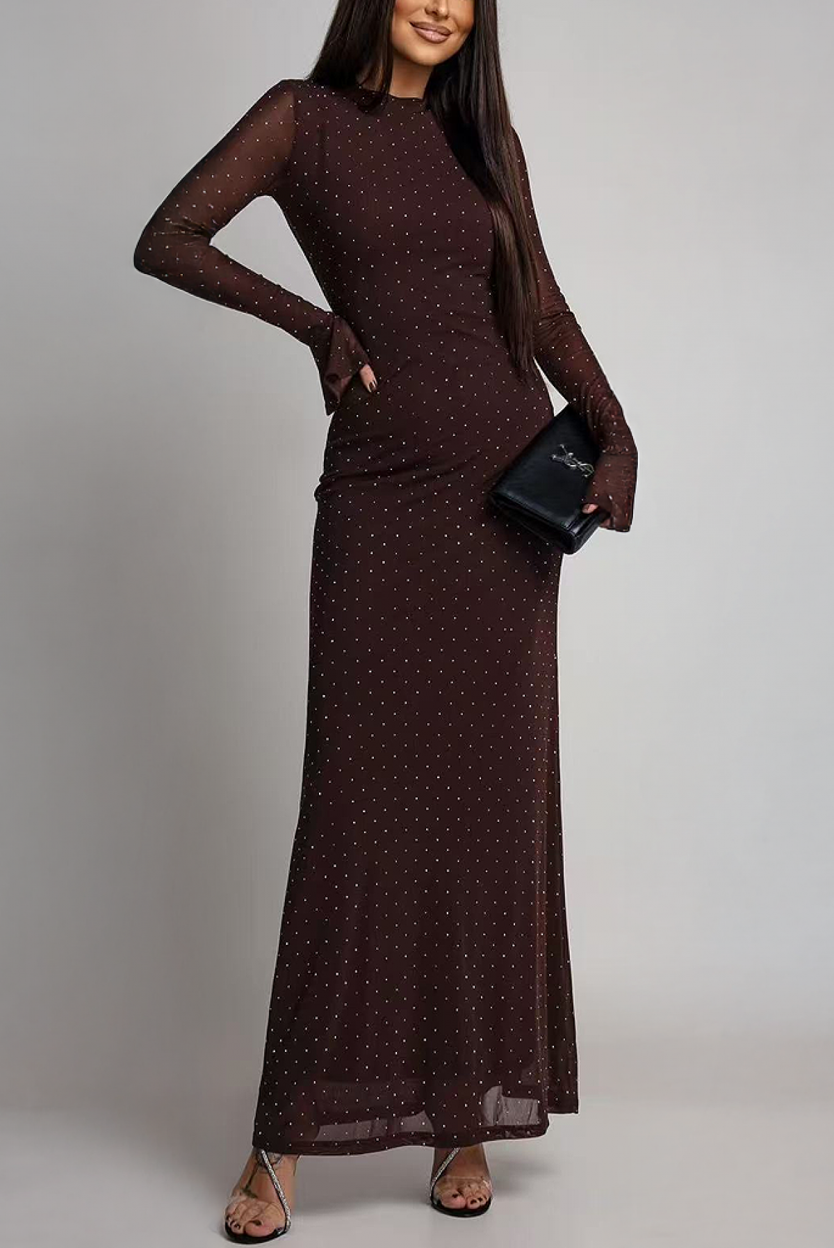- A modell testhezálló szabású, hosszú ujjú, csillogó részletekkel, nyitott háttal rendelkezik.
