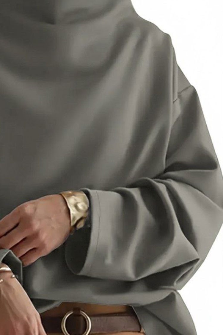 - A blúz hosszú ujjú, elegáns túlméretezett szabással és stílusos magas nyakkal rendelkezik.