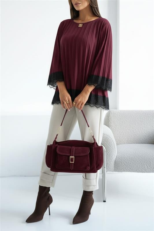 - A modell elegáns szabással, egyszínben, rakott dizájnnal és csipkével rendelkezik.