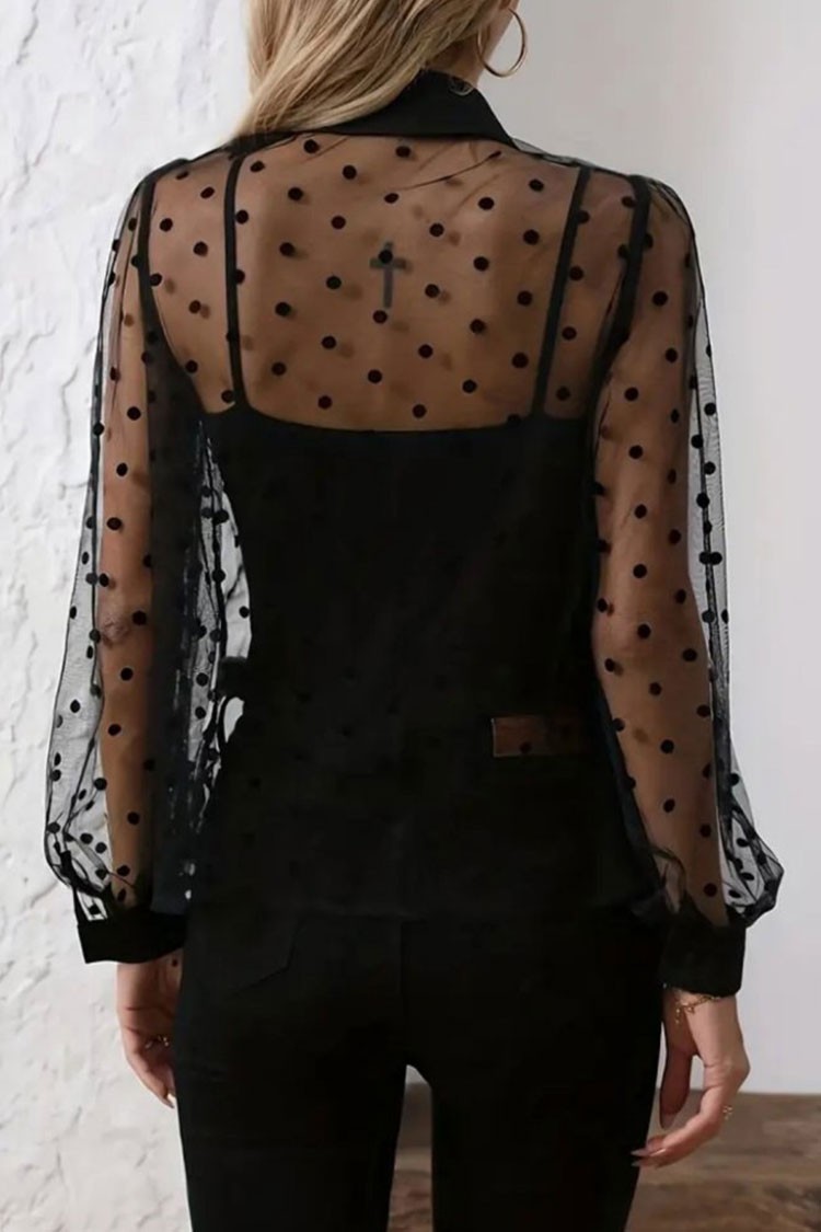 - A blúz hosszú ujjú, standard gombos rögzítésű és átlátszó anyagú, a felső pedig egyszerű fazonú, fekete színű.